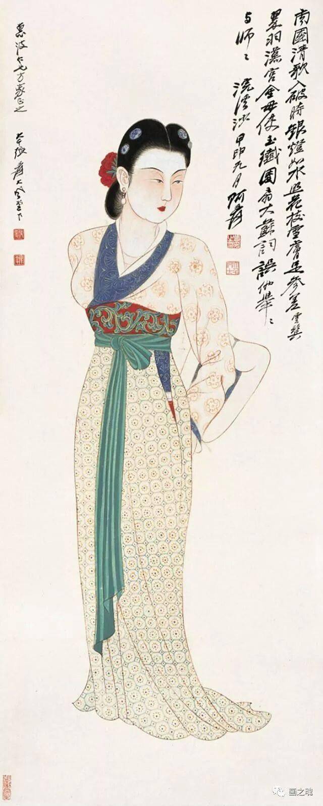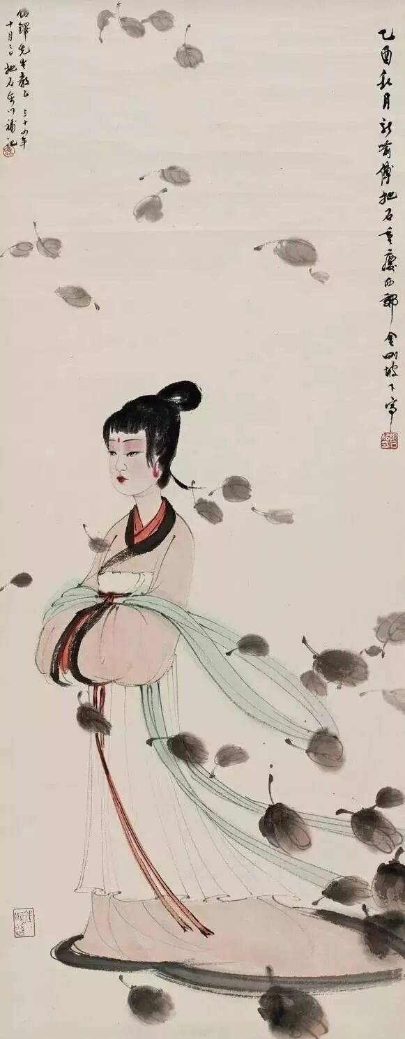 张大千善于绘画美人,也懂得欣赏美人,他能用妙女拈花的笔法,传出女儿的心声,这一点是他的艺术微妙。在他的笔下既有优雅的少妇,风华绝代的仙女,也有受了惊吓的贵妃,各种类型、各种情绪美人的风情都被他刻画得细致入微。