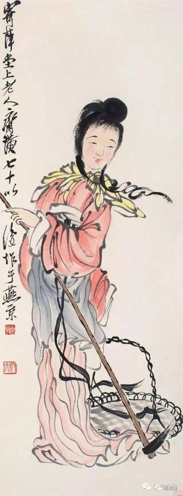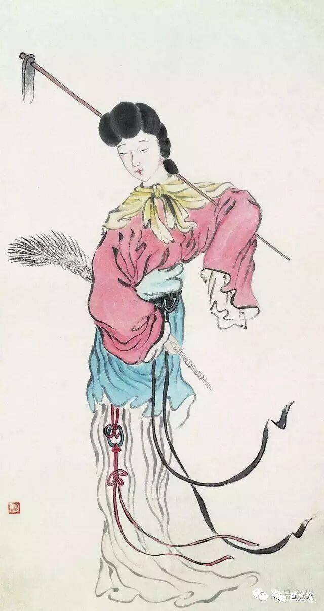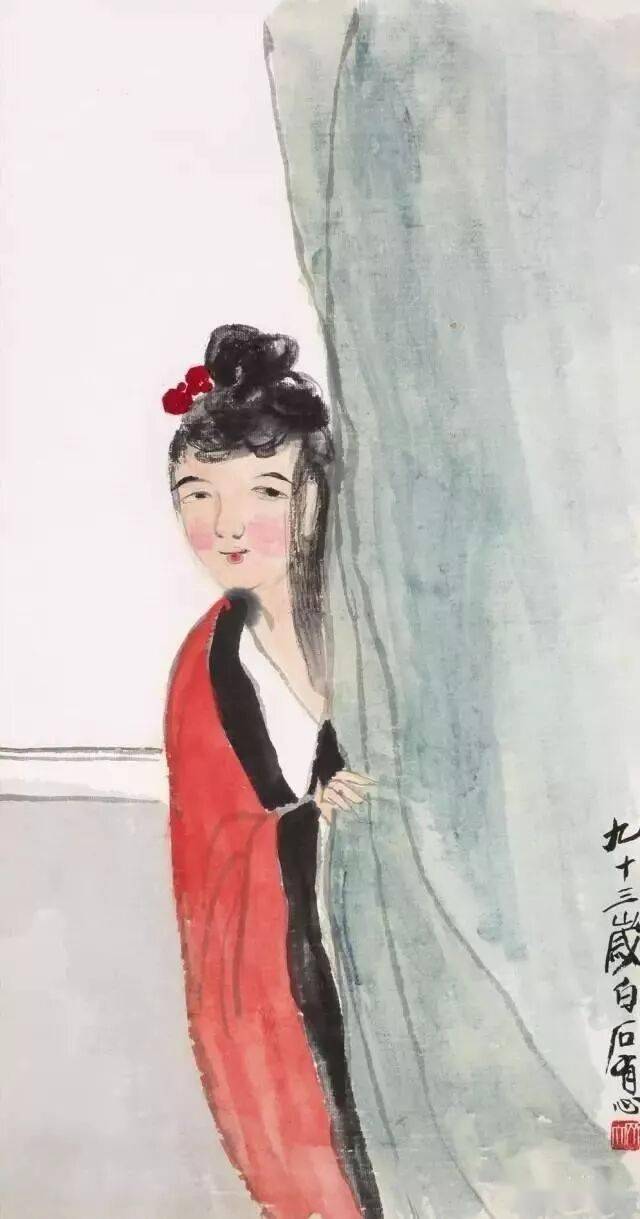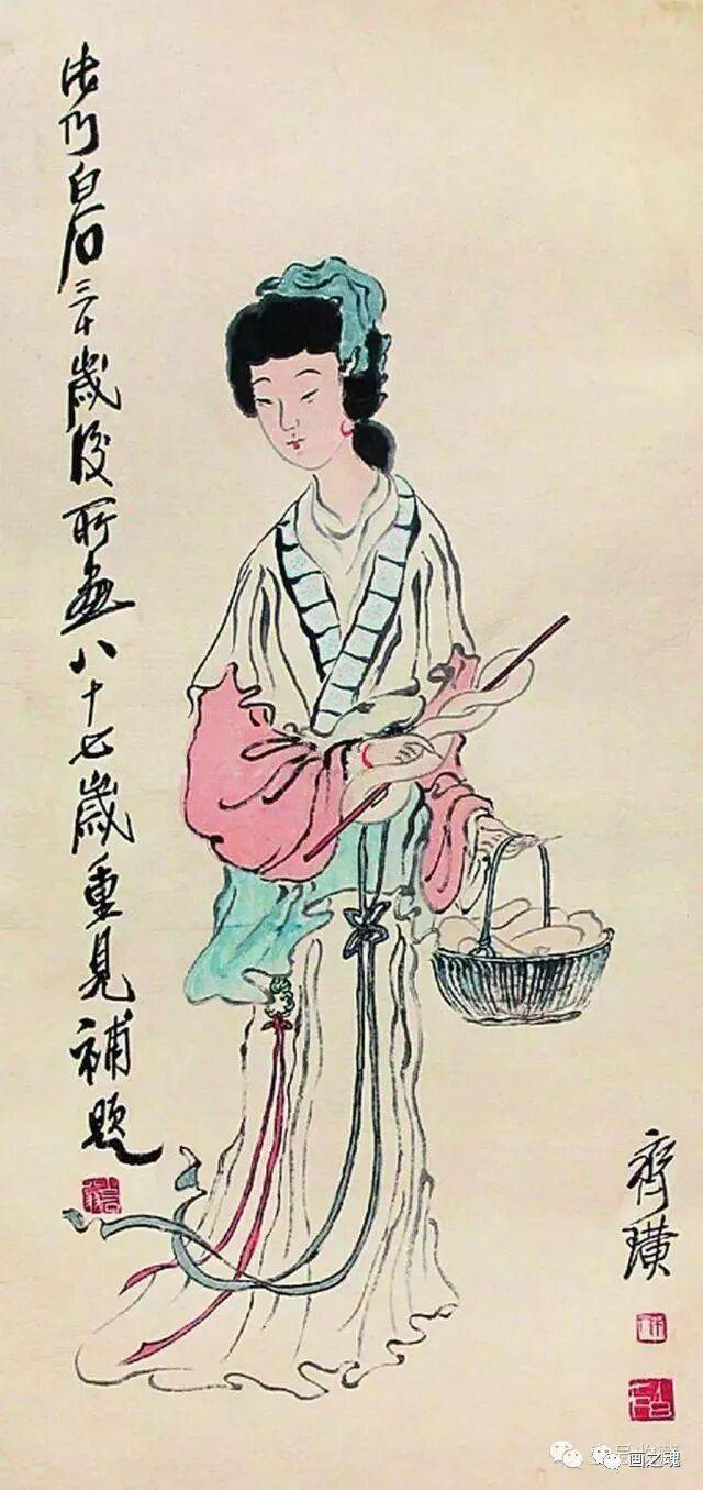齐白石喜欢以记忆里的人物形象入画,用笔减而富有意趣,形象简而蕴内涵。他笔下的仕女和其他人物画一样,别具风格,每一个造形无一不反映着自已的生活感受无时无刻都在体现着大俗即大雅的境界,他将八大、石涛和金农的画风融为一体,用笔减省、意趣横生,更不乏善良、朴素、睿智、幽默。