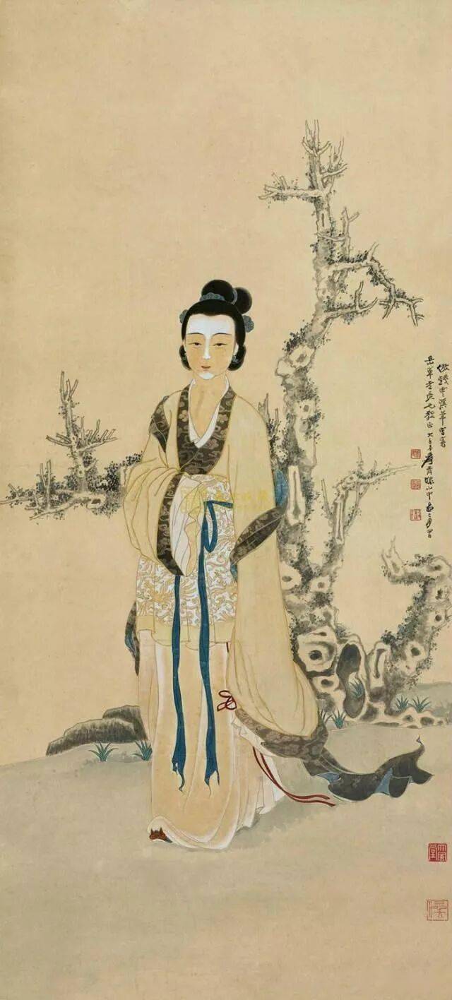 张大千的仕女可谓清丽秀雅、别有风姿。因为他眼中的美人标准要比常人苛刻得太多,不仅要长得美,而且气质要“娴静娟好,有林下风度,遗世而独立之姿,一涉轻荡,便为下乘”。