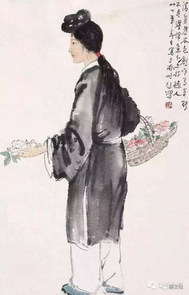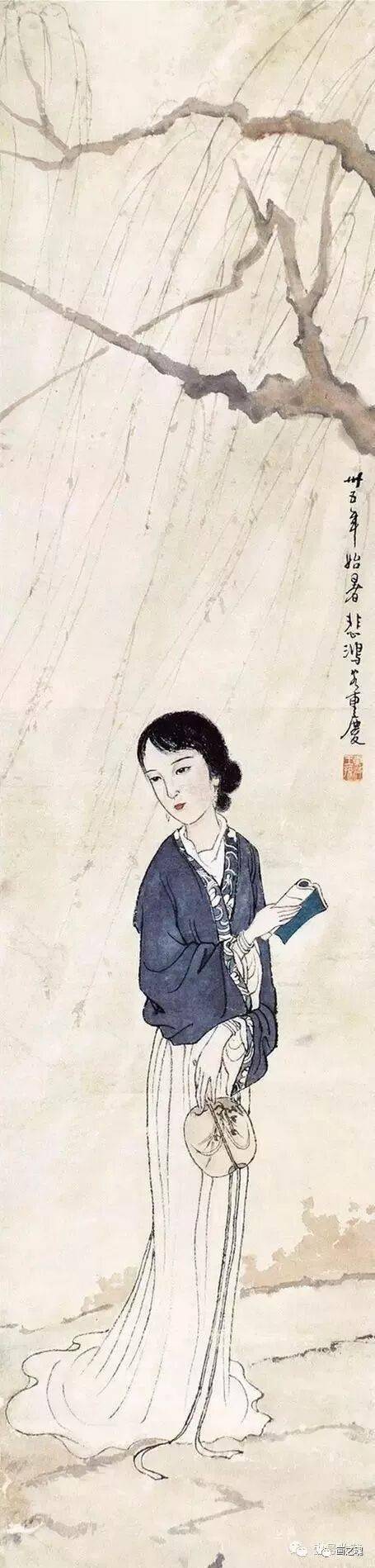 徐悲鸿的仕女人物的造型、线条以传统的国画手段勾勒,而五官和手的刻画、脸部和裙子的渲染,则融入西画技巧,因此在柔美的身段之外,透出一股英气,这在中国近代仕女画中独树一帜。