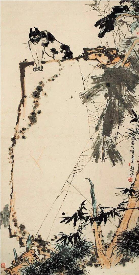 潘天寿 猫石芭蕉图 上世纪50年代设色、指墨 237.5×120cm