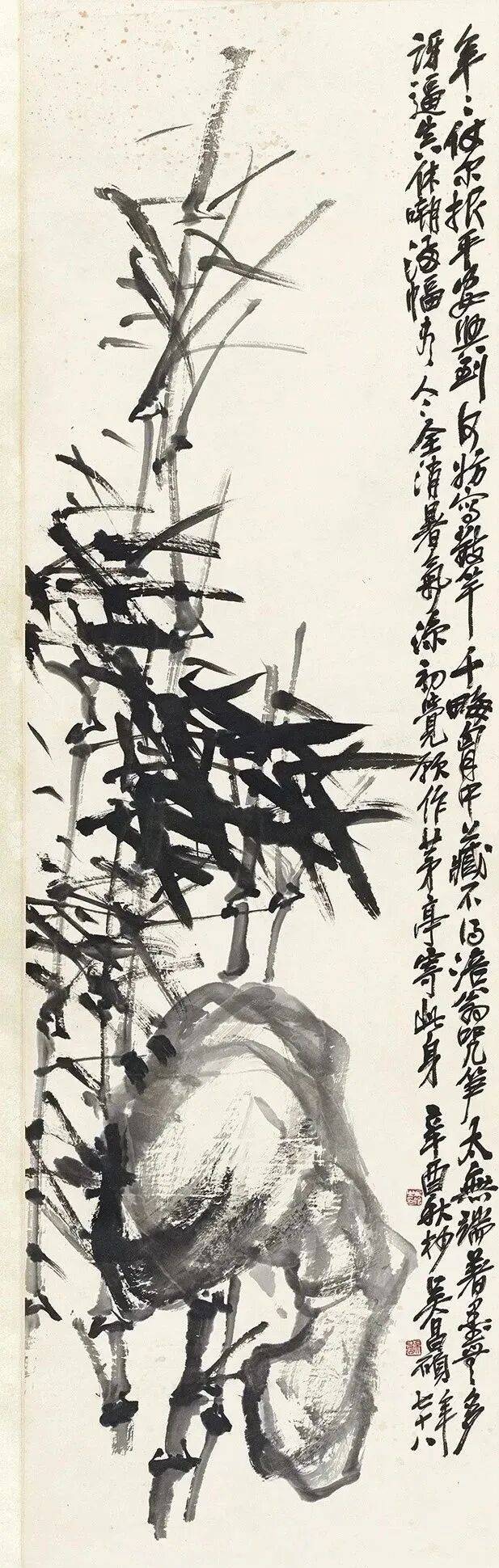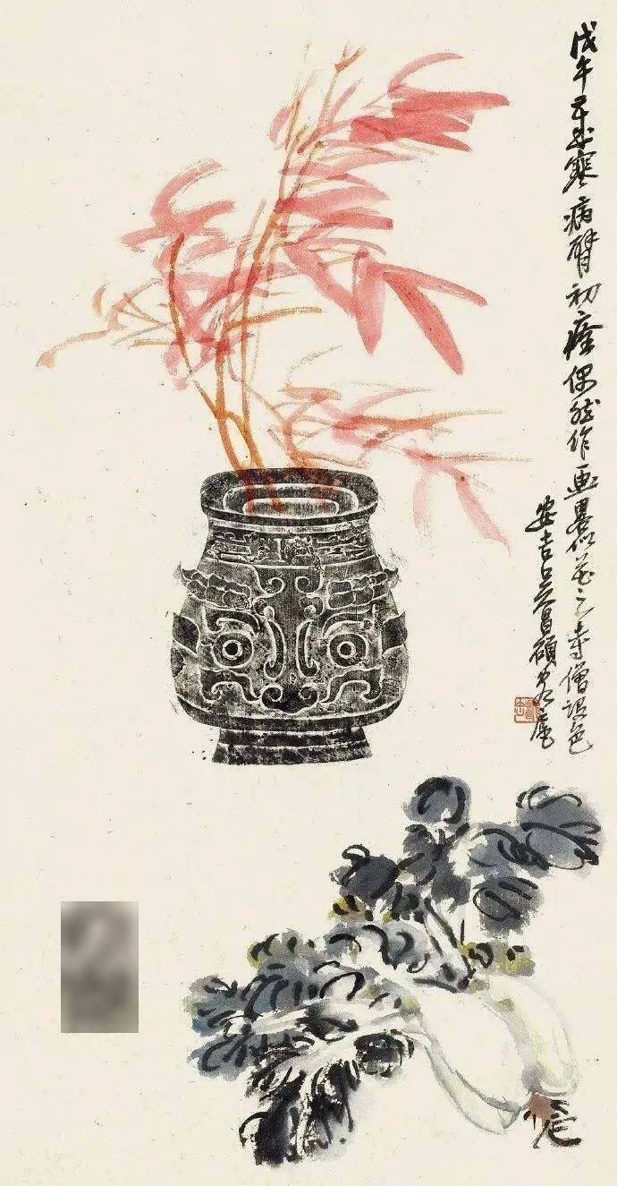 他打破文人画淡雅传统,大胆使用西洋红、藤黄、浓绿等鲜艳对比色,却能与墨色协调,艳而不媚,古雅厚重。