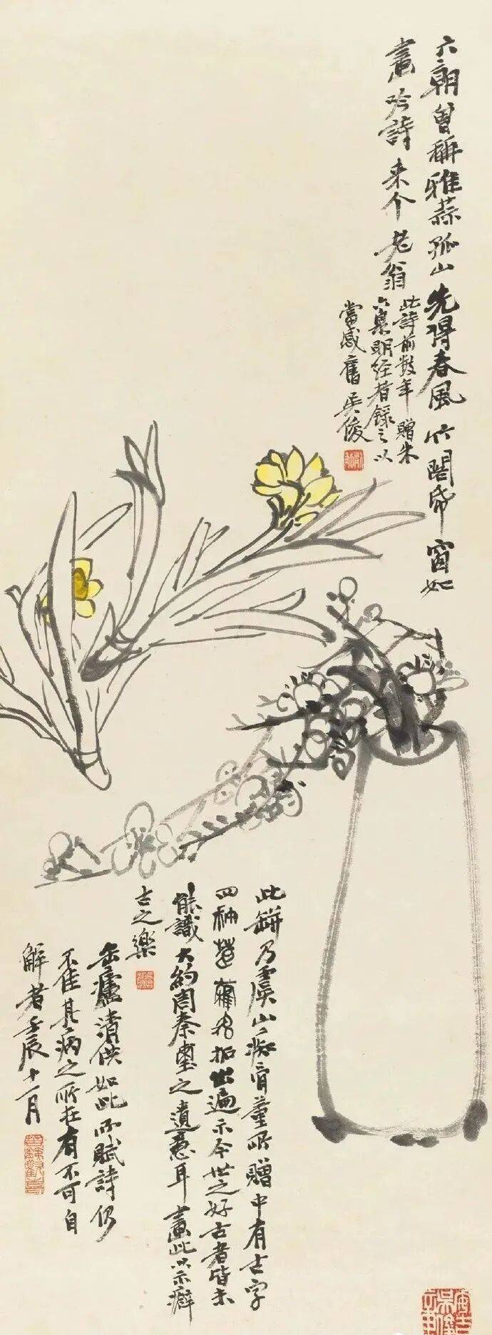 “字加上画”,正是吴昌硕艺术最动人的地方——他将书法的笔意、篆刻的金石气与绘画的构图、色彩融为一体,真正实现了 “诗书画印” 四绝合一。他的画不是孤立的图像,而是流动的书法线条与深厚笔墨精神的延伸。