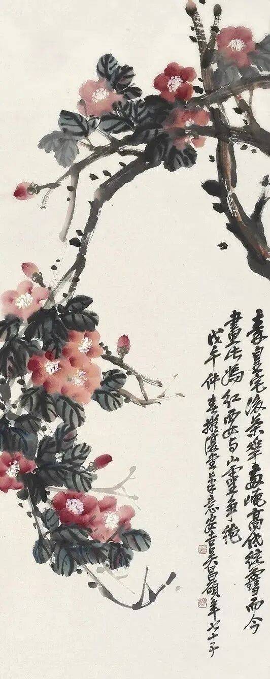 吴昌硕喜用 “之” 字形或对角斜势布局,虚实呼应,主体突出,近似书法章法与篆刻布白。