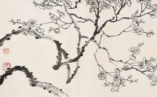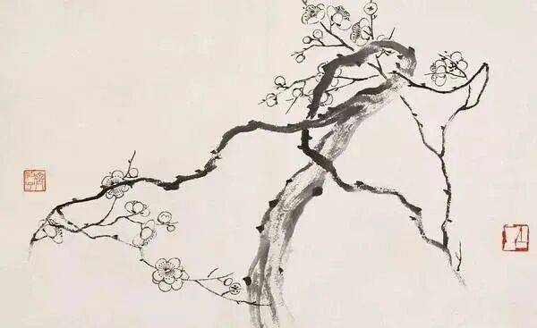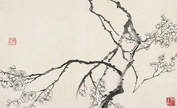 齐白石早年(约30岁前后)遍临明清名家,金农是其重点学习的对象之一。他对金农画梅的渴笔焦墨技法、以书入画的线条刻意摹仿——金农画梅喜用硬毫枯笔,线条凝练如篆籀,枝干多作斜欹之势,花瓣简淡疏落,齐白石早期梅花作品中,枝干的苍劲顿挫、花瓣的简约留白,都能看到金农的影子。