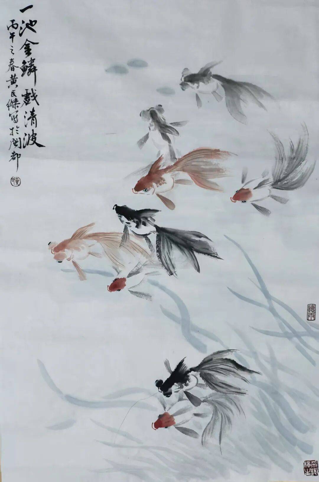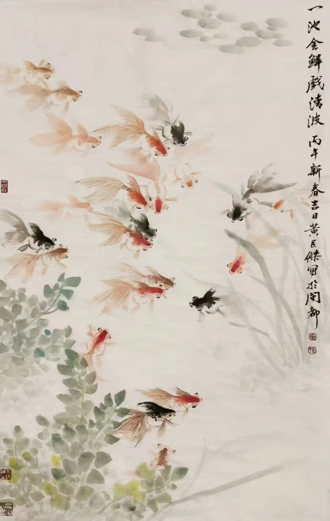 色彩的运用更是黄民杰先生画作的一大亮点。他巧妙地运用了丰富的色彩,将金鱼的艳丽和灵动展现得恰到好处。金黄的、火红的、雪白的金鱼在水中交相辉映,如同一幅绚丽多彩的水下画卷。那鲜艳的色彩,不仅展现了金鱼的美丽,更传递出一种欢快和生机勃勃的氛围。
