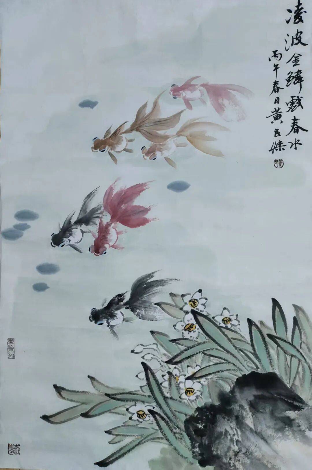 细品黄民杰先生笔下的金鱼形态各异、灵动生姿。有的金鱼身躯修长,线条流畅,宛如优雅的舞者在水中翩翩起舞;有的金鱼圆润可爱,憨态可掬,让人忍不住想要伸手触摸。鱼尾的摆动、鱼鳍的舒展,都以细腻的笔触和精准的线条描绘得淋漓尽致。