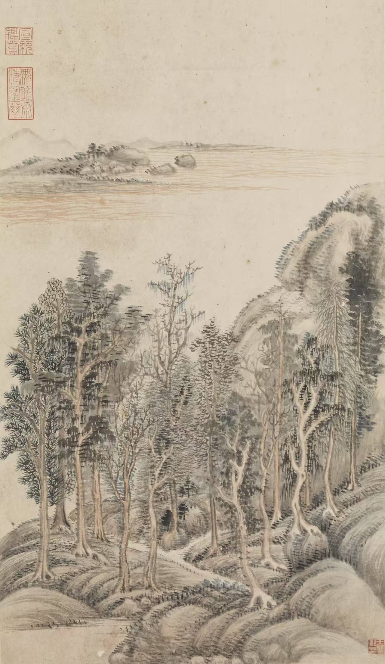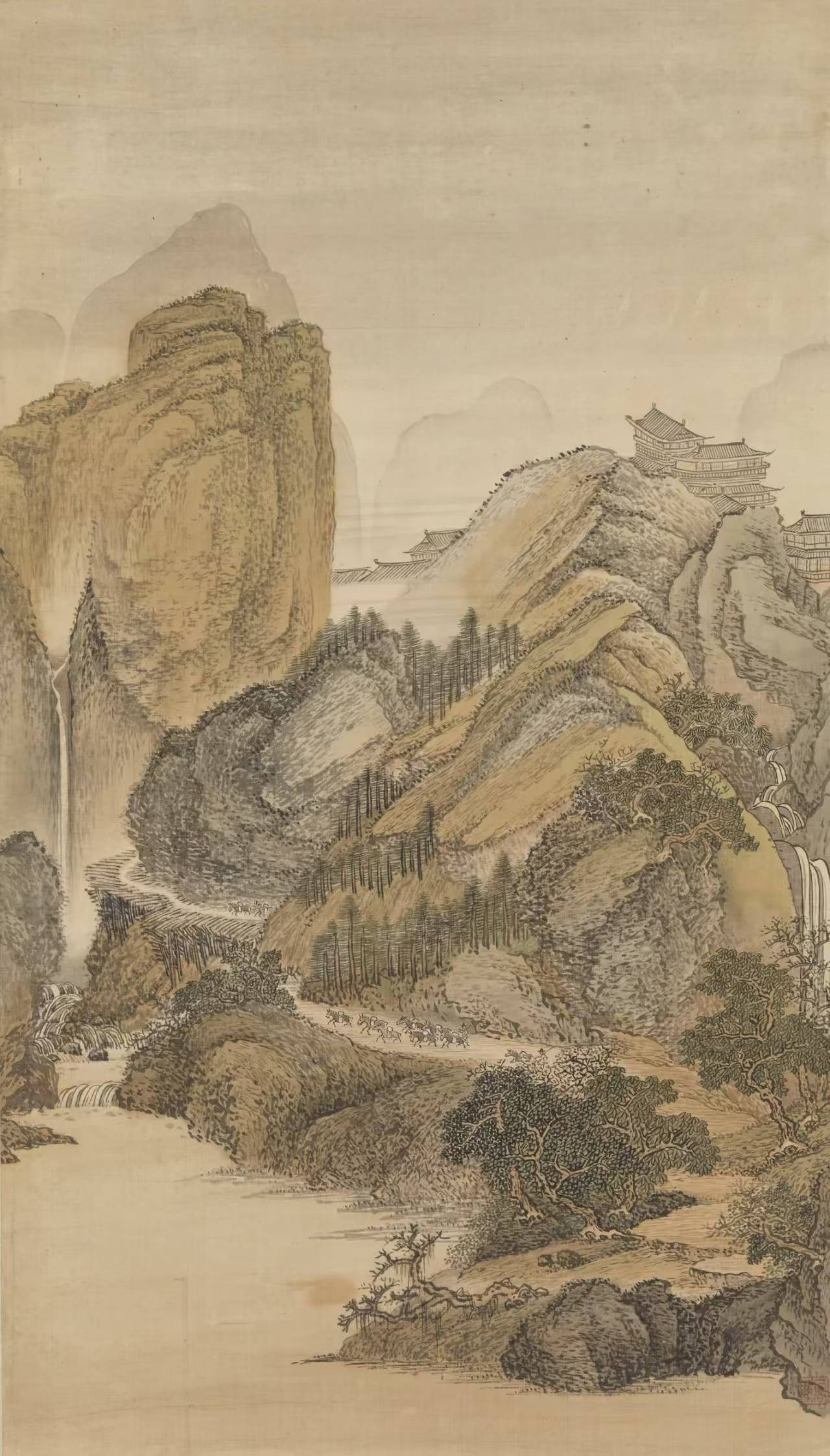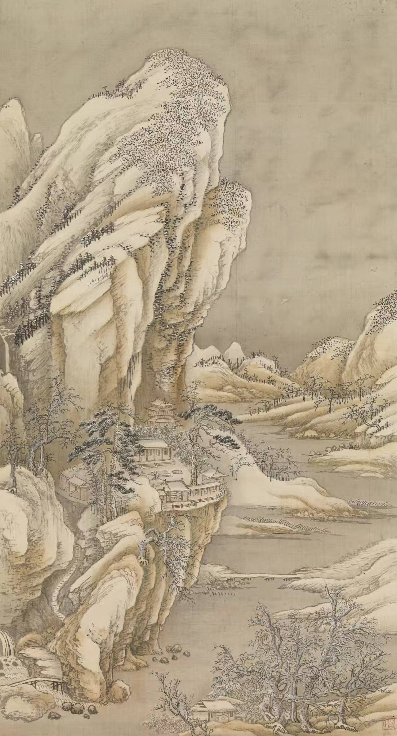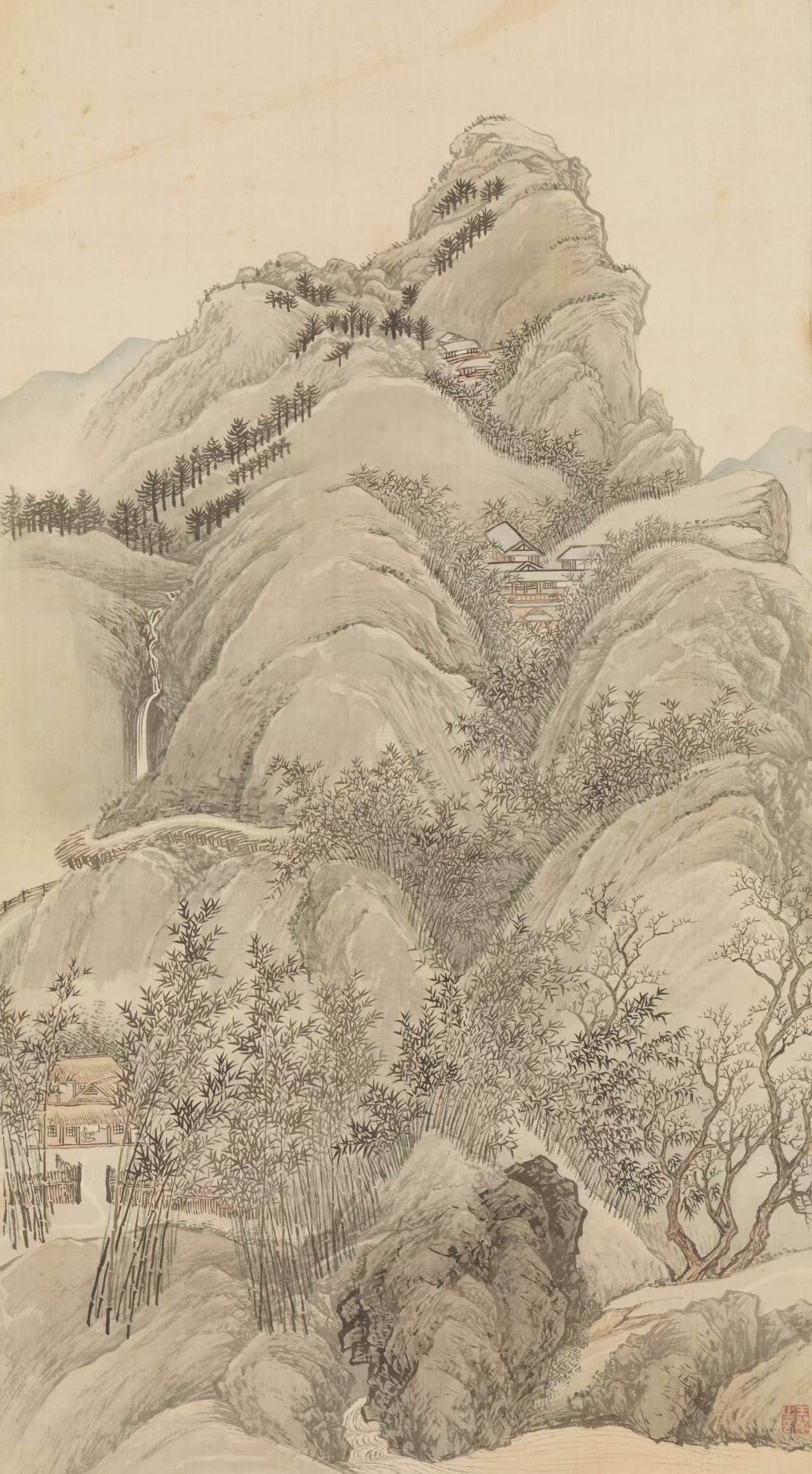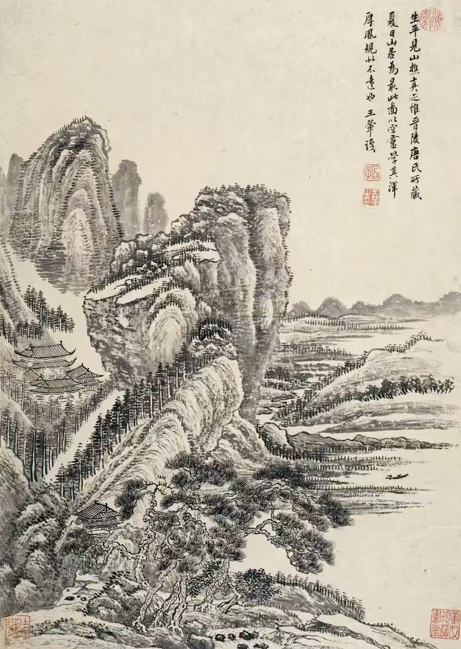 王翚自幼嗜画,继承家学,又随学黄公望画法的同乡张珂学画,很早便表现出非凡的绘画才能。王翚师从王时敏、王鉴。但他所画山水不拘于一家,广采博揽,集唐宋以来诸家之大成,熔南北画派为一炉。王翚在王时敏、王鉴发展南宗画派的基础上,借鉴北宗的某些技法,比较全面地对山水画传统进行整理,形成具有综合概括性质的法则。