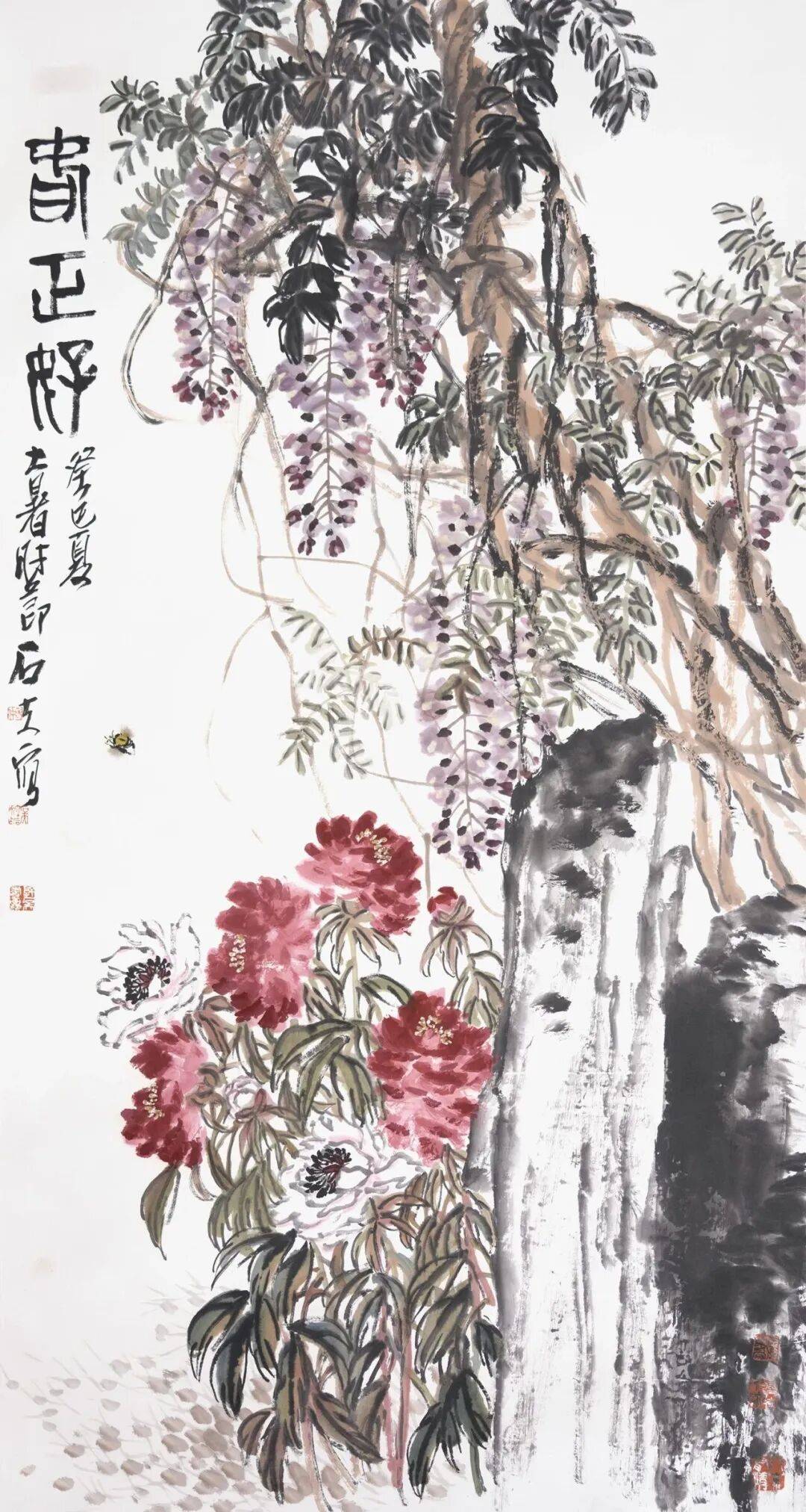 先生之大写意花鸟,深植传统正脉,直承青藤、白阳、八大之逸韵,继吴昌硕、齐白石、潘天寿之精髓,尤得苦禅先生笔墨之雄魂,于古法中深得写意之真谛。其用笔以书法入画,中锋立骨,篆隶笔意融于毫端,线条厚重老辣、笔笔见力,力透纸背,无一笔虚浮。绘梅枝则虬曲苍劲,藏金石之味;写藤萝则蜿蜒盘旋,具草书之姿;画荷杆则挺拔劲直,彰君子之骨,勾勒点染,皆循法度,于挥洒间见谨严,于率真中藏斟酌。其用墨尤见功力,泼墨、积墨诸法随心而用,浓淡干湿相生相济,焦墨写干,浓墨点叶,淡墨铺韵,飞白见骨,墨色层次万千,浑融通透,如《藤花图》以焦墨枯笔写老藤,淡紫点花,墨彩相融,苍润相间,于简淡中见生机,于厚重中藏灵秀。