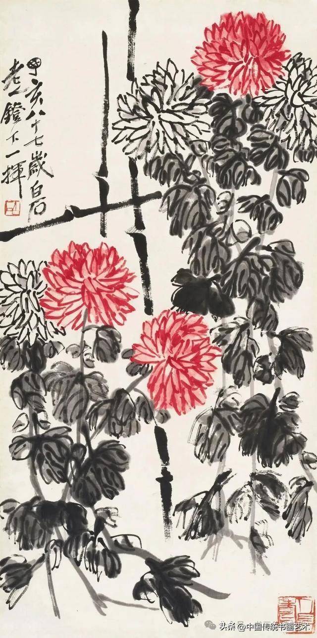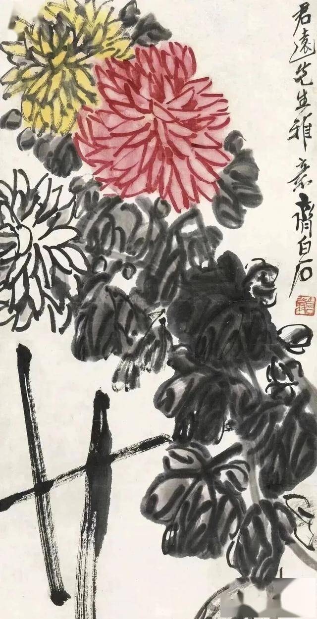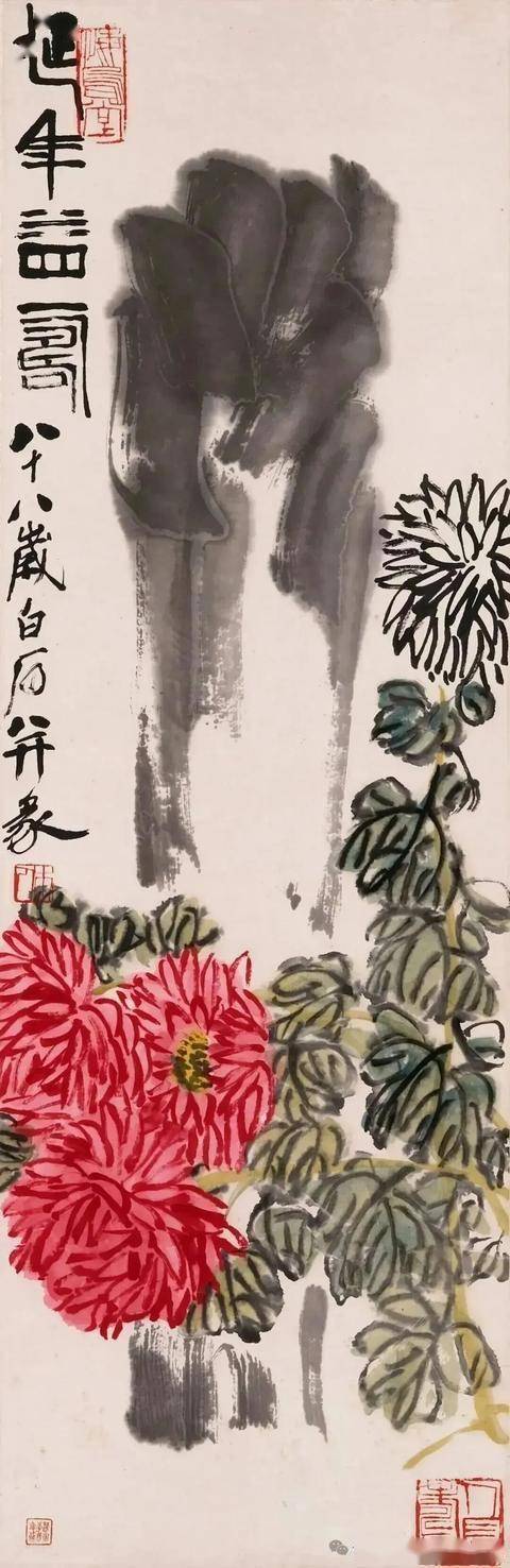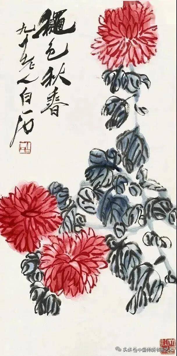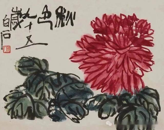 齐白石的菊花画技,是中国近现代写意花鸟画的巅峰代表之一,其艺术风格在“衰年变法”后趋于成熟,形成了鲜明的个人语言——以“红花墨叶”为标志,笔简意丰,妙在“似与不似之间”。