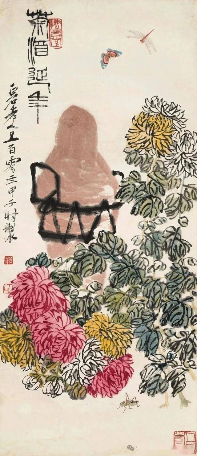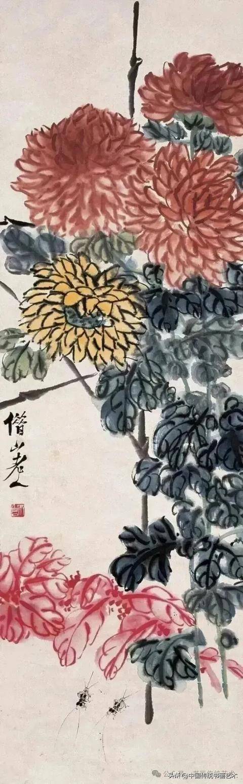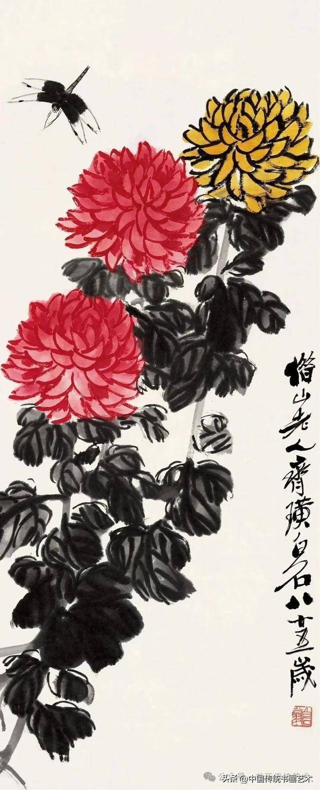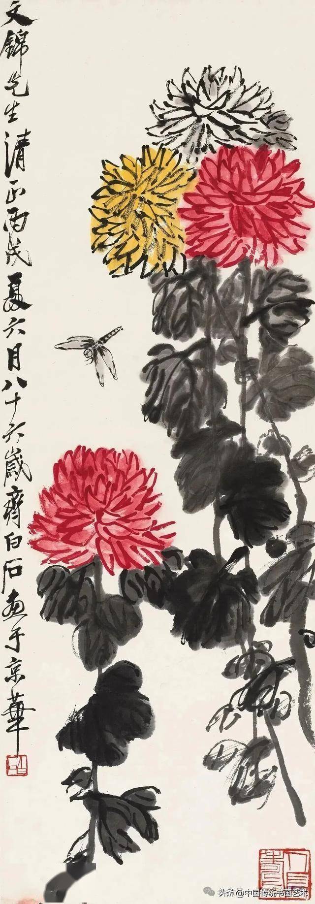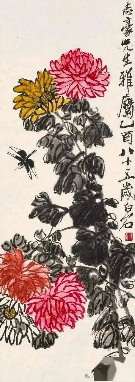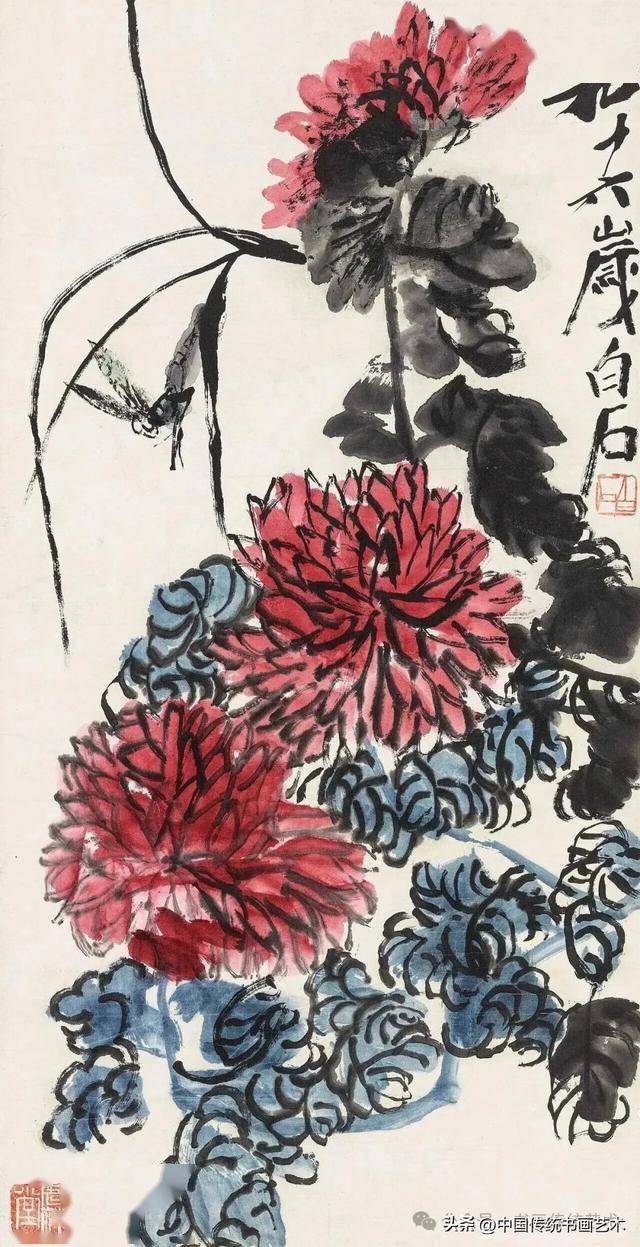 齐白石早年受吴昌硕影响,但并未止步于模仿。他在《菊花蜻蜓》等作品中,将金石笔意与生活观察融合,创造出既有金石力度又不失灵动的风格。其弟子许麟庐虽继承“红花墨叶”,但在叶法上创新为“青黛色”,赋予更多抽象秩序感,可见齐派艺术的深远影响。