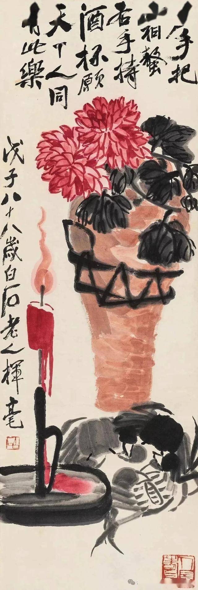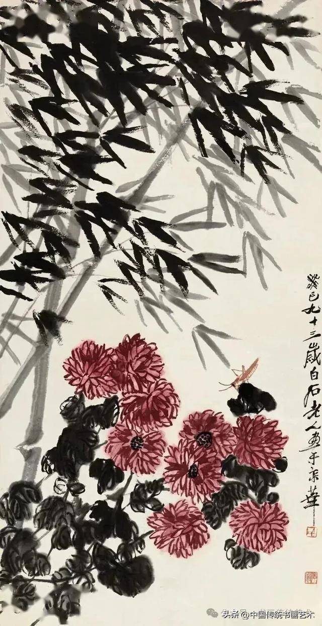 齐白石打破传统文人画“淡雅为宗”的审美,大胆使用洋红点染菊花,配以浓墨叶片,形成“红花墨叶”的经典风格。这种色彩对比强烈却不失和谐,既保留了民间艺术的喜庆气息,又融入了文人画的笔墨意趣,真正实现了“雅俗共赏”。