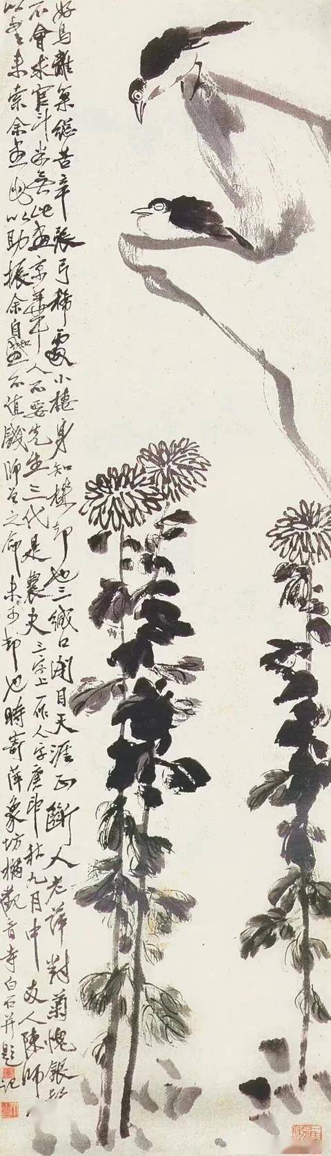 他在《菊花八哥》中题诗:“菊花正色未为工,不入时人众眼中。草木也知通世法,舍身学得牡丹红”,借菊抒怀,表达自己不媚世俗、坚持本真的艺术态度。