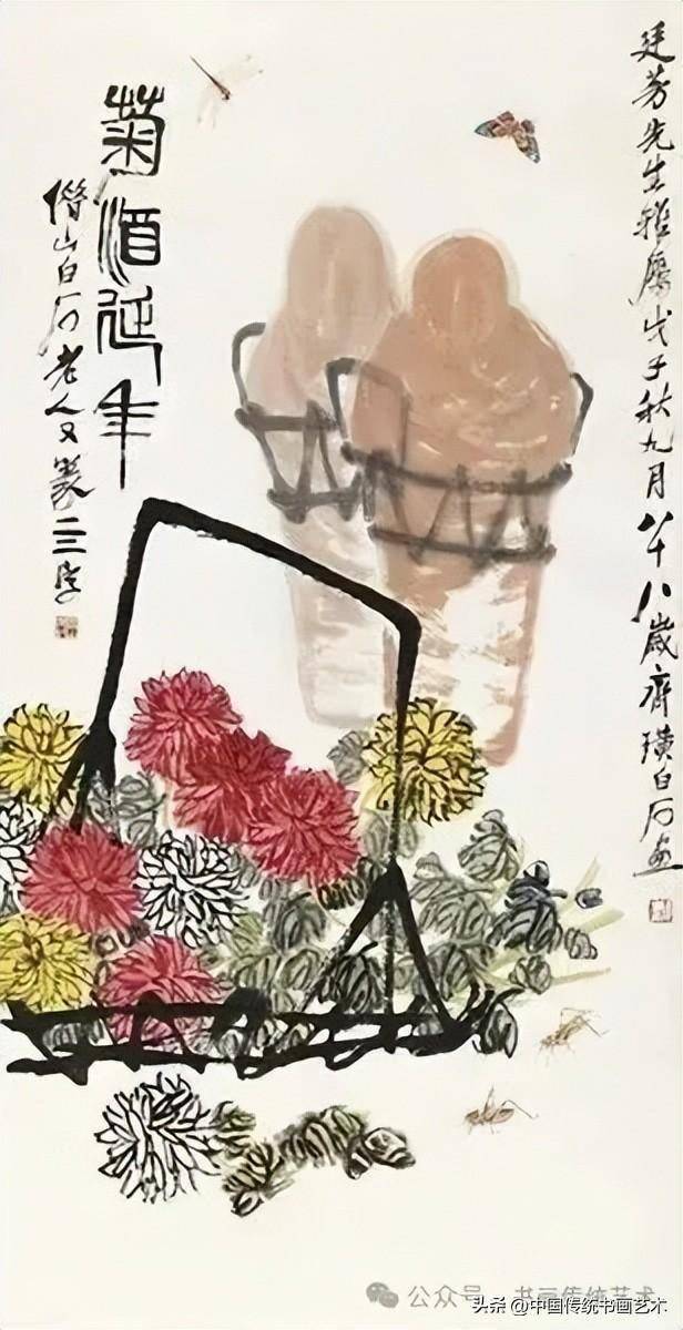 齐白石的菊花题材常与酒坛、草虫、竹篱等日常物象结合,如《菊酒延年》《菊花草虫》等,赋予作品浓厚的生活气息与吉祥寓意。“菊酒”谐音“久久”,象征长寿安康;草虫点缀其间,增添生机与趣味,也体现“每兼虫鸟,则花草自然有工致气”的创作理念。