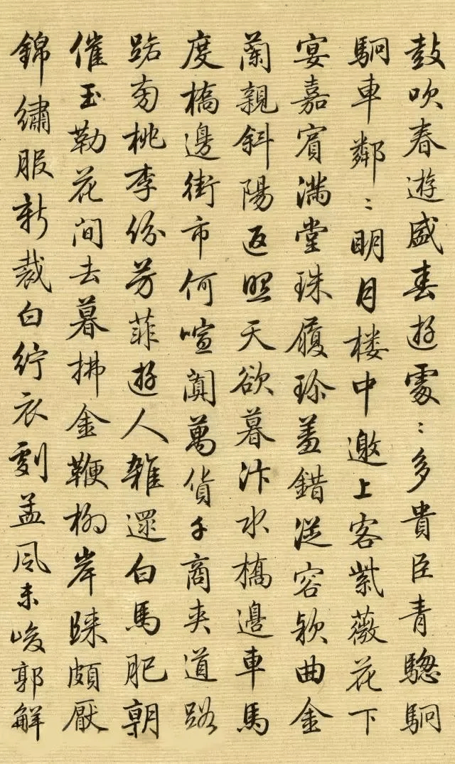 【3】鼓吹春逰盛。春逰处处多贵臣,青骢駉駉车邻邻。明月楼中邀上客,紫薇花下宴嘉宾。满堂珠履珍羞错,从容欵曲金兰亲。斜阳返照天欲暮,汴水桥邉车马度。桥邉街市何喧阗,万货千商夹道路。路旁桃李纷芳菲,逰人杂遝白马肥。朝催玉勒花间去,暮拂金鞭栁岸归。颇厌锦绣服,新裁白紵衣,剧孟风未峻,郭觧