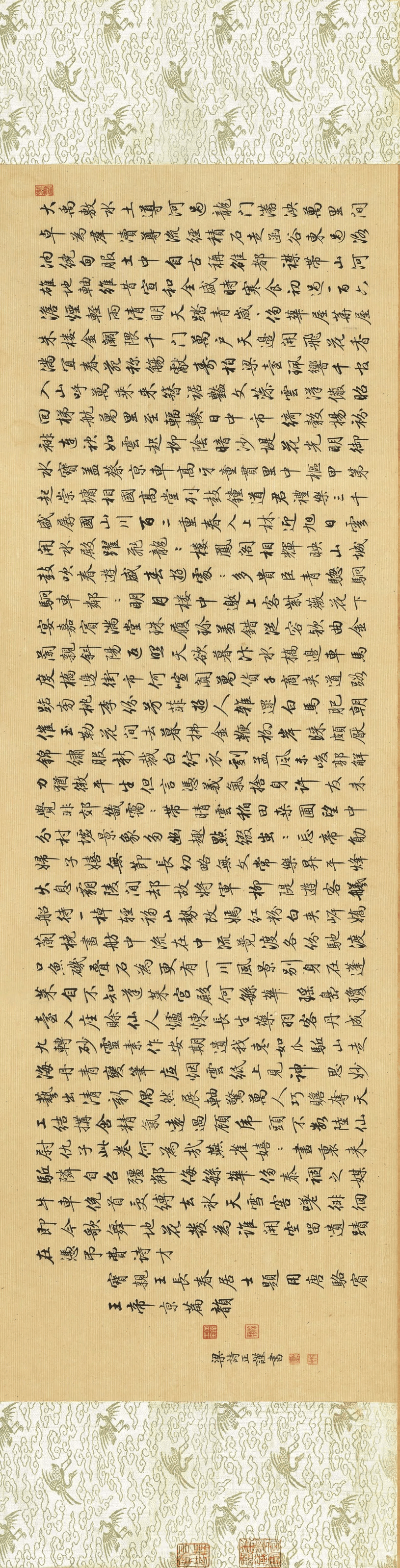 梁诗正《骆宾王帝京篇》纸本,尺寸28.76*112.81厘米。这是梁诗正的小行书,结构端庄,笔画清晰,在特制绢纹的映衬下,有一种从容不迫的美。梁诗正乃是清朝时期罕见在书法中,呈现出丰富个人笔意的书法家,从他此作可以看出,有柳公权、赵孟、文徵明三家书风,又有自家风貌,脱离了馆阁体的桎梏。