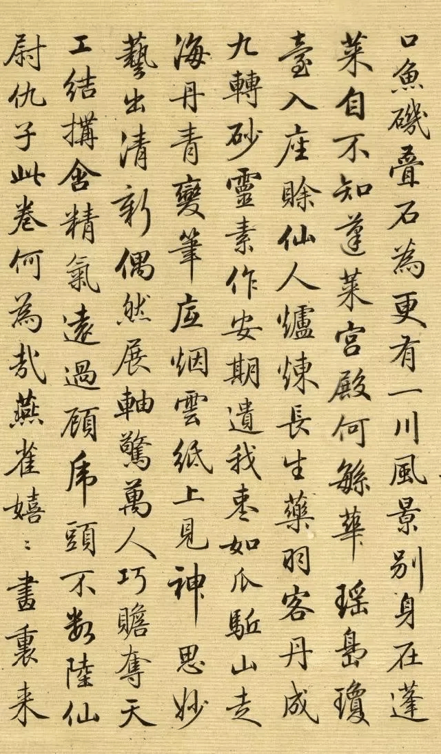 【5】口鱼矶迭石为。更有一川风景别,身在蓬莱自不知。蓬莱宫殿何繁华,瑶岛琼台入坐賖。仙人炉炼长生药,羽客丹成九转砂。灵素作安期,遗我枣如瓜。驱山走海丹青变,笔底烟云纸上见。神思妙艺出清新,偶然展轴惊万人。巧赡夺天工,结构含精气。逺过顾虎头,不数陆仙尉。仇子此卷何为哉,燕雀嬉嬉画里来。