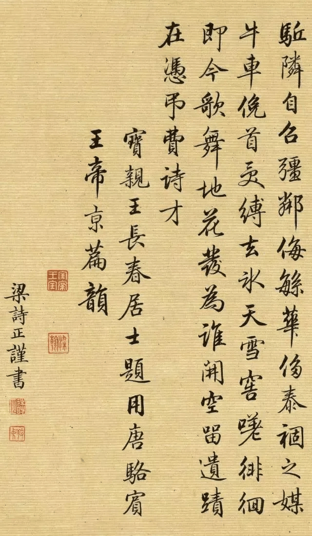 【6】駈邻自召彊邻侮,繁华侈泰祸之媒。牛车俛首受缚去,氷天雪窖嗟徘徊。即今歌舞地,花发为谁开。空留遗迹在,憑弔费诗才。宝亲王长春居士题,用唐骆宾王帝京篇韵。梁诗正谨书。