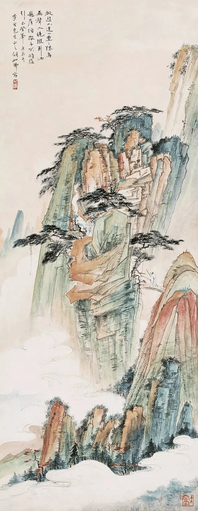 胡也佛的山水画艺术成就卓著,其风格融合宋元传统与近现代创新,展现出独特的笔墨语言和审美境界。他早年师法南宋马远、夏圭,笔墨苍劲有力,结构严谨自如,尤以斧劈皴表现山石肌理,刚劲洒脱,富有力度感。在继承传统的基础上,胡也佛并未拘泥于古法,而是大胆融入西洋画的色彩与光影表现手法,使画面更具空间层次与视觉张力。