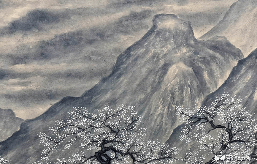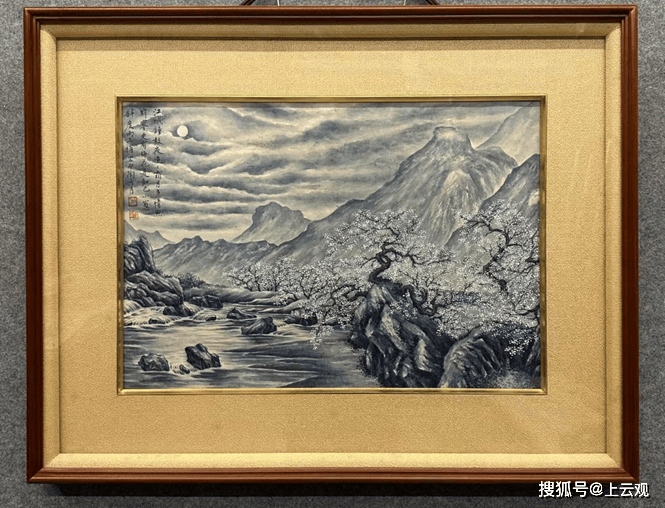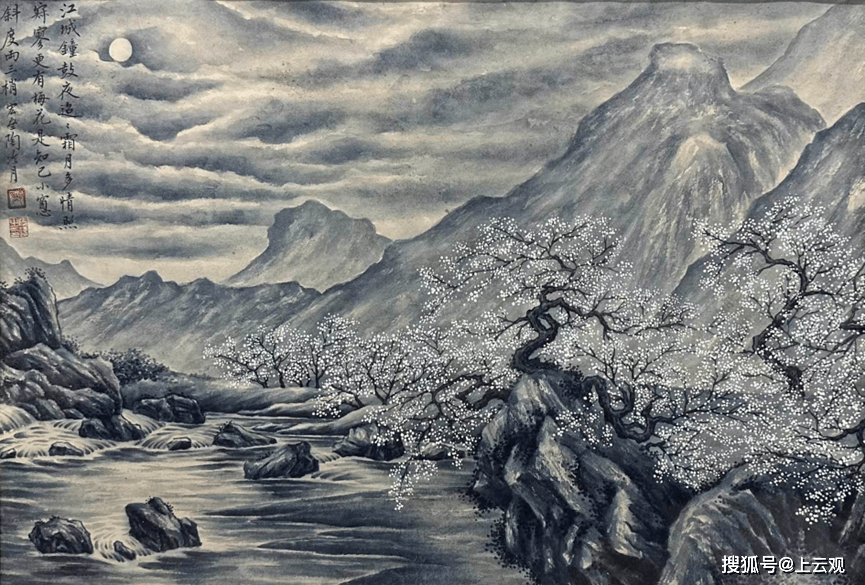 《月夜山水梅花图》正是其艺术理念的完美结晶。此作构图精妙,气韵生动:远山层峦叠嶂,以淡墨烘染出朦胧夜色;近景奇石嶙峋,梅树苍劲挺拔,繁花似雪;水面波光粼粼,一轮皓月隐现云端,营造出静谧悠远的空间感。上有皓月当空,下有寒梅映水,左有青山作衬,右有繁花点缀,虚实相生、动静相宜,尽显大师构图功力。画面将山水的雄浑、月色的清寂、梅花的高洁融为一体,构成一幅诗意盎然、意境深远的画卷。