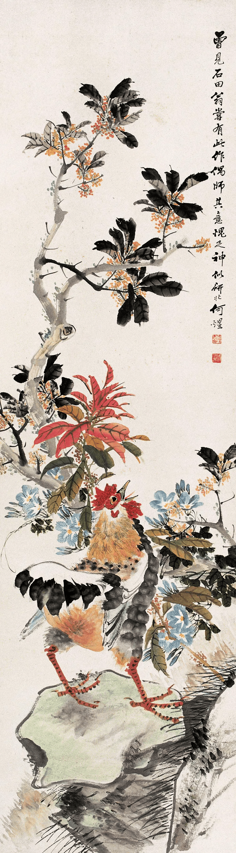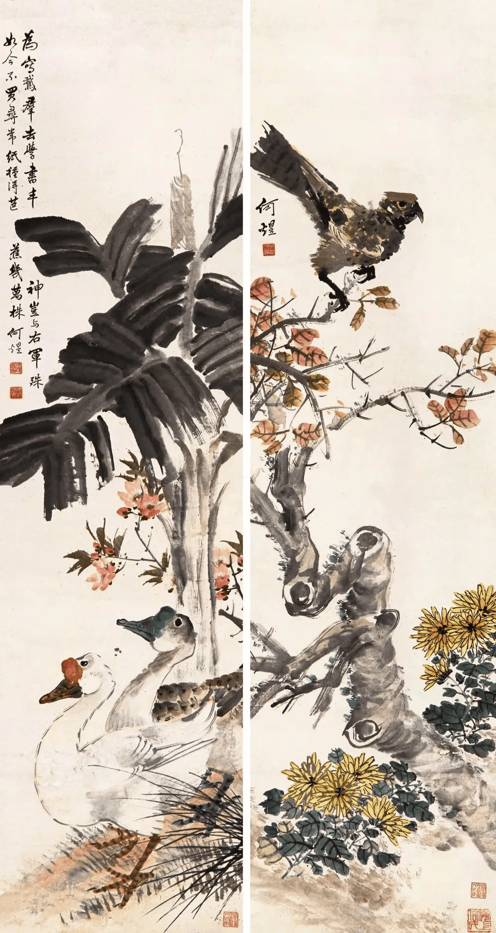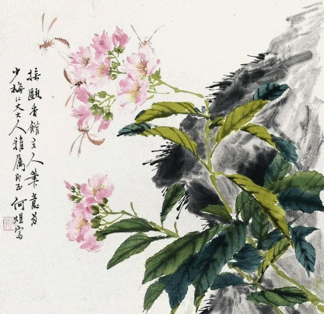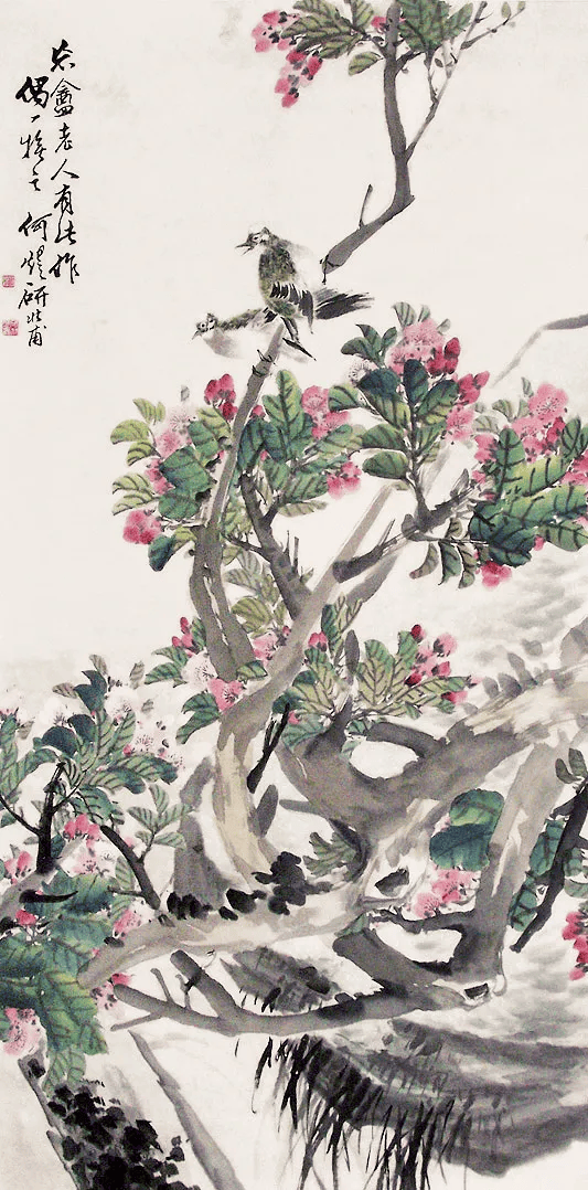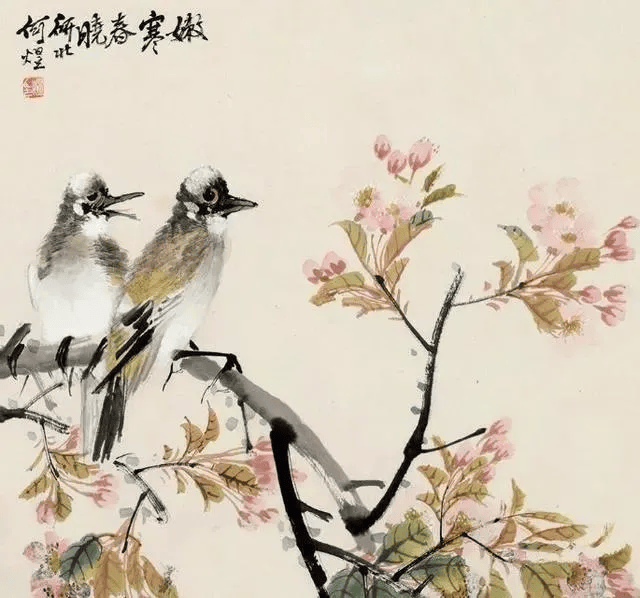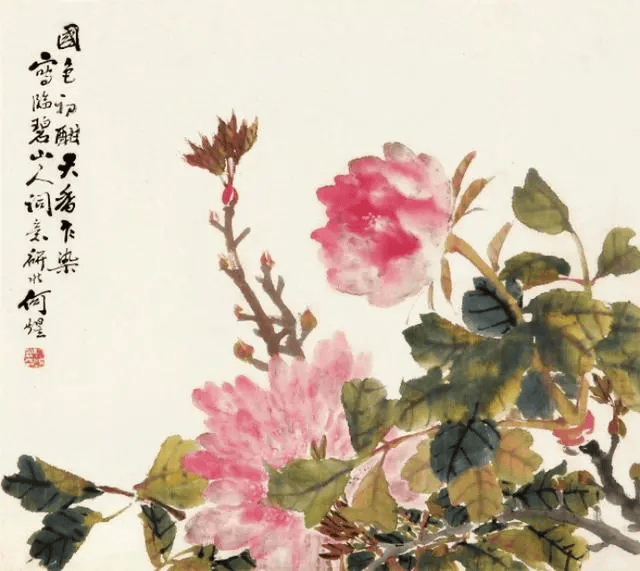 看画中花卉禽鸟,造型简练概括中不失精微,或没骨晕染,或勾花点叶,运笔之飞快,似乎顷刻而成。观何煜的花鸟画,栩栩如生,似有鸟鸣在耳,既俗又雅,才最深得人心。