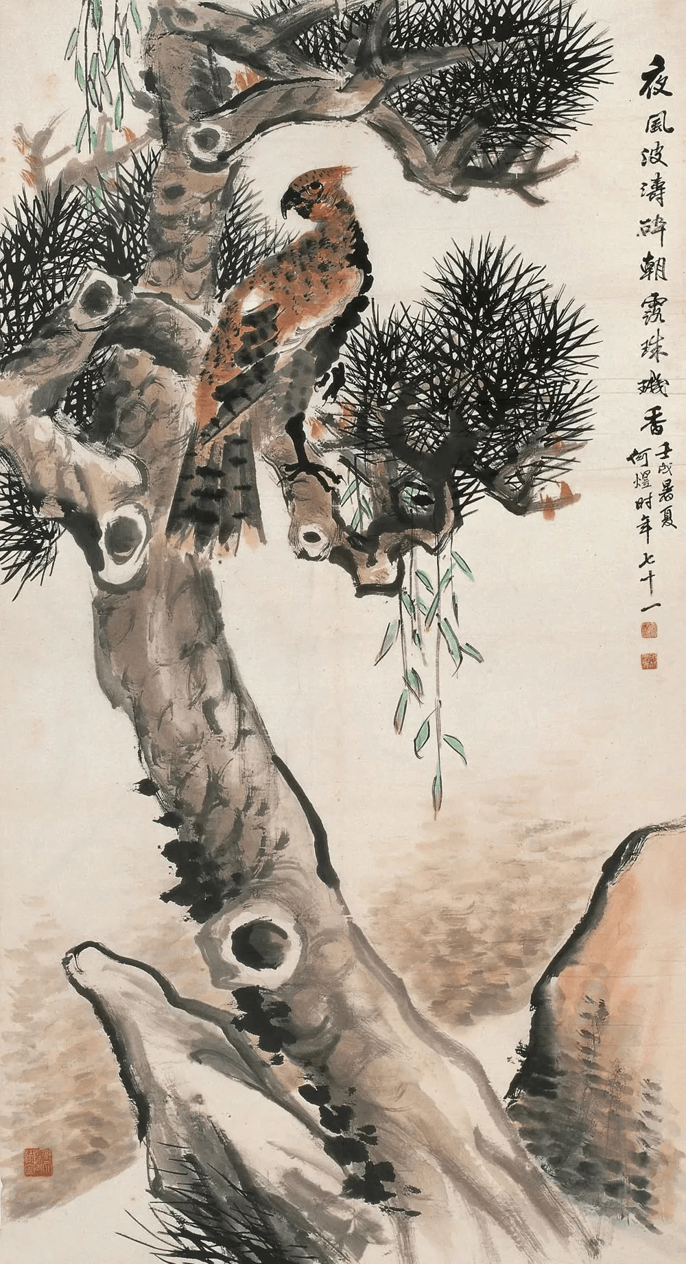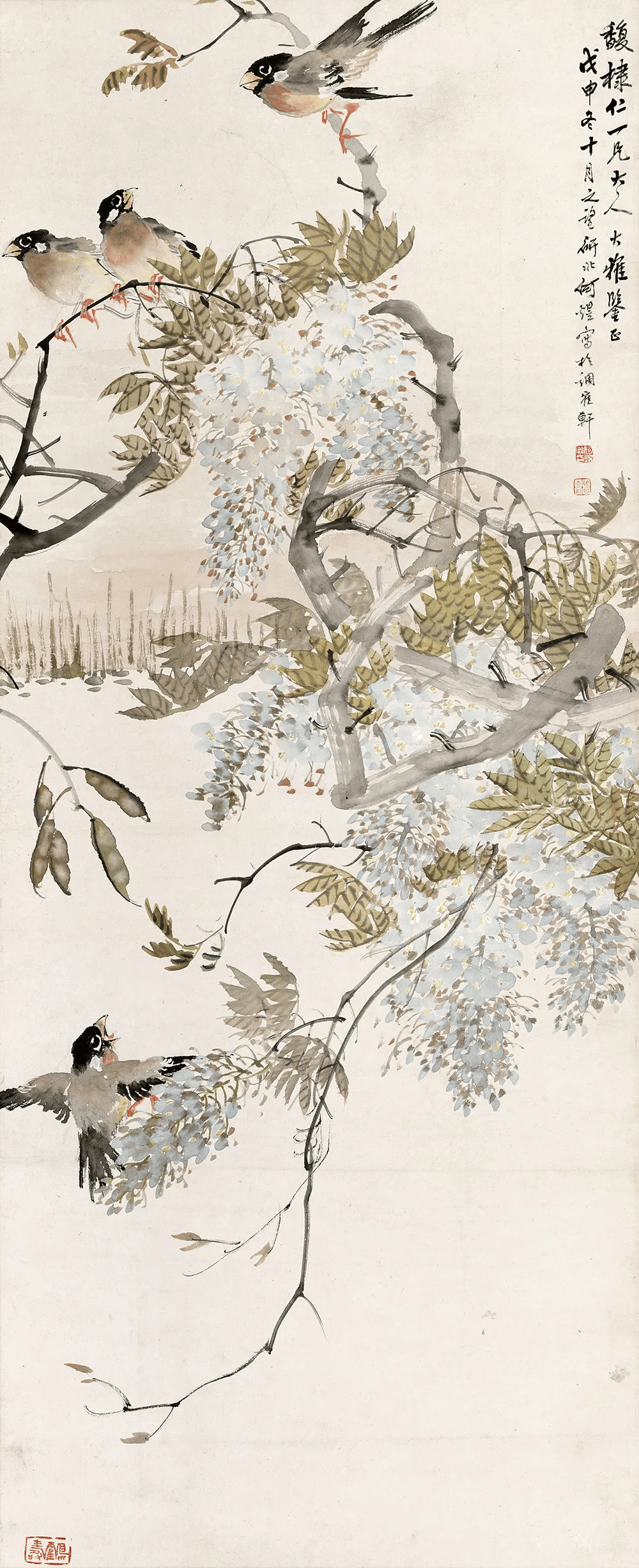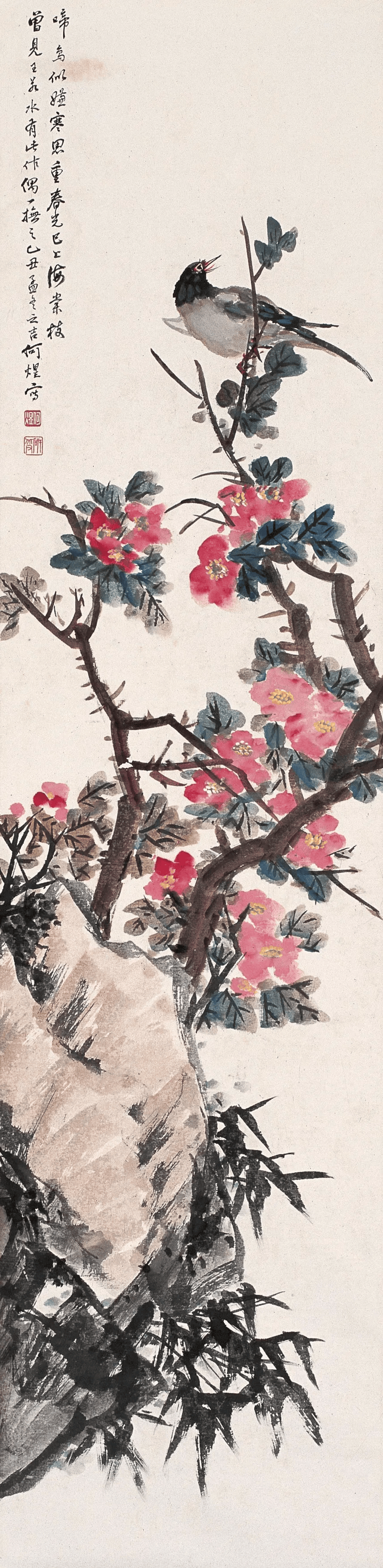 看画中花卉禽鸟,造型简练概括中不失精微,或没骨晕染,或勾花点叶,运笔之飞快,似乎顷刻而成。观何煜的花鸟画,栩栩如生,似有鸟鸣在耳,既俗又雅,才最深得人心。