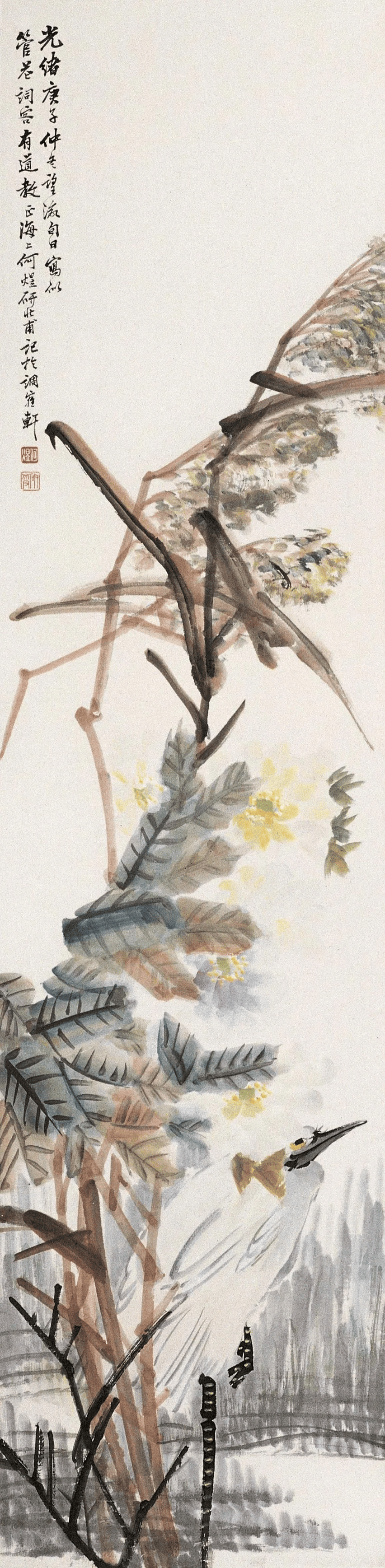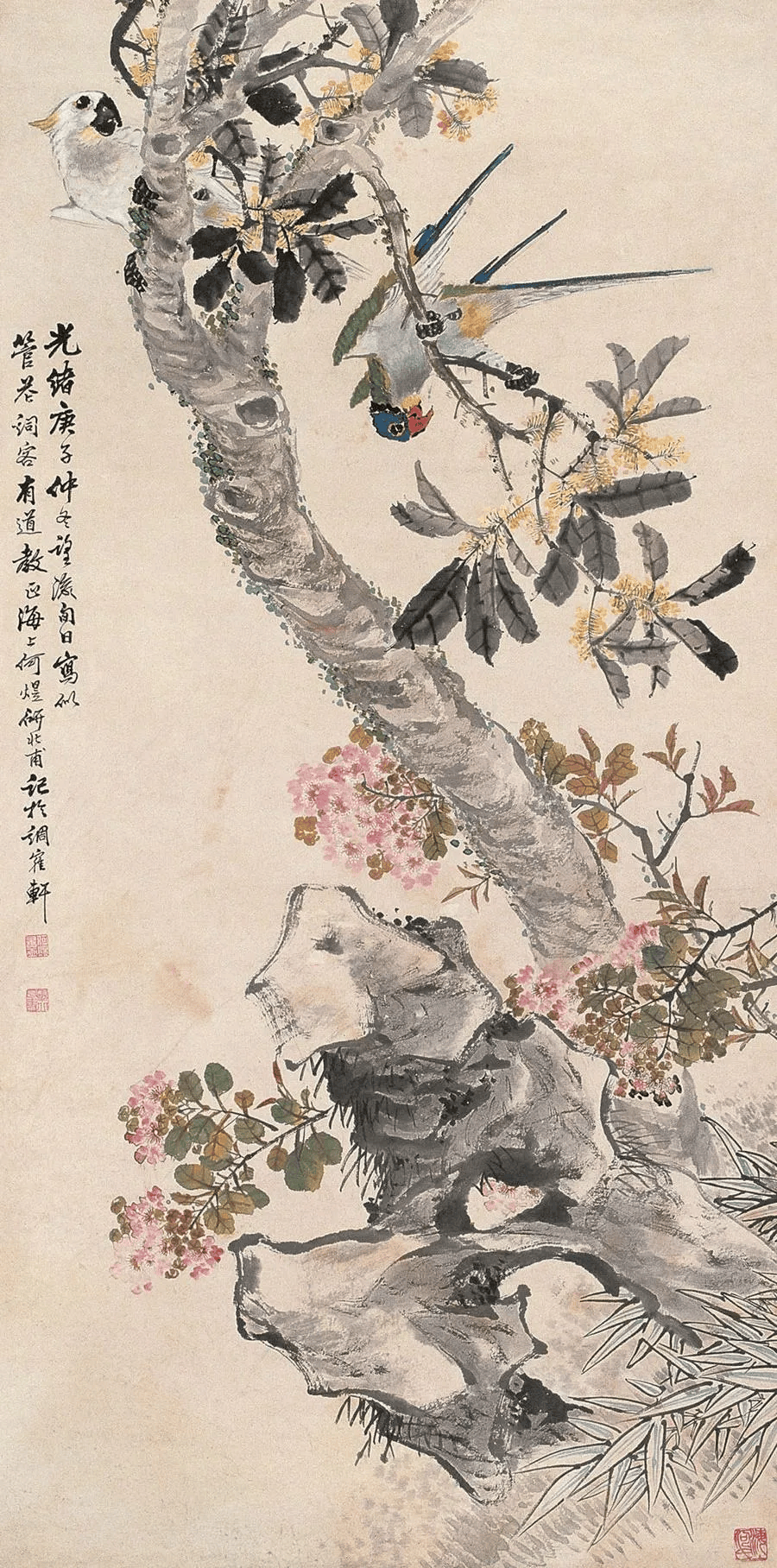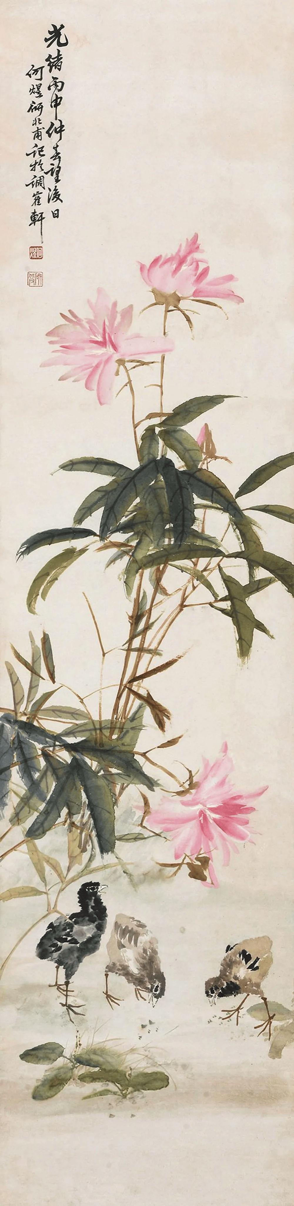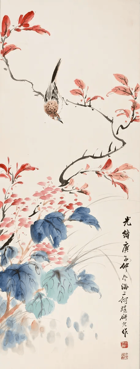 何煜擅画没骨花鸟、草虫。其作品以精妙绝伦的笔墨、清润典雅的设色、热烈生动的意境,一度名噪上海,并成为近现代海上画坛的重要代表人物。