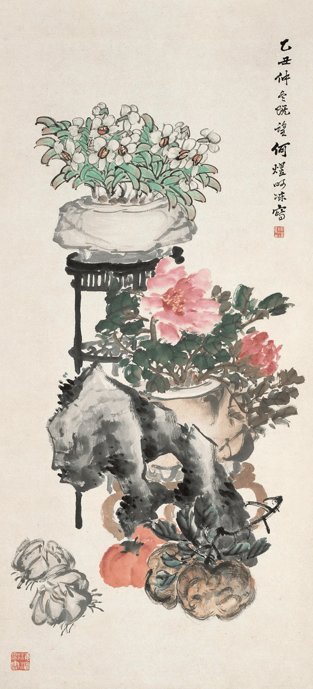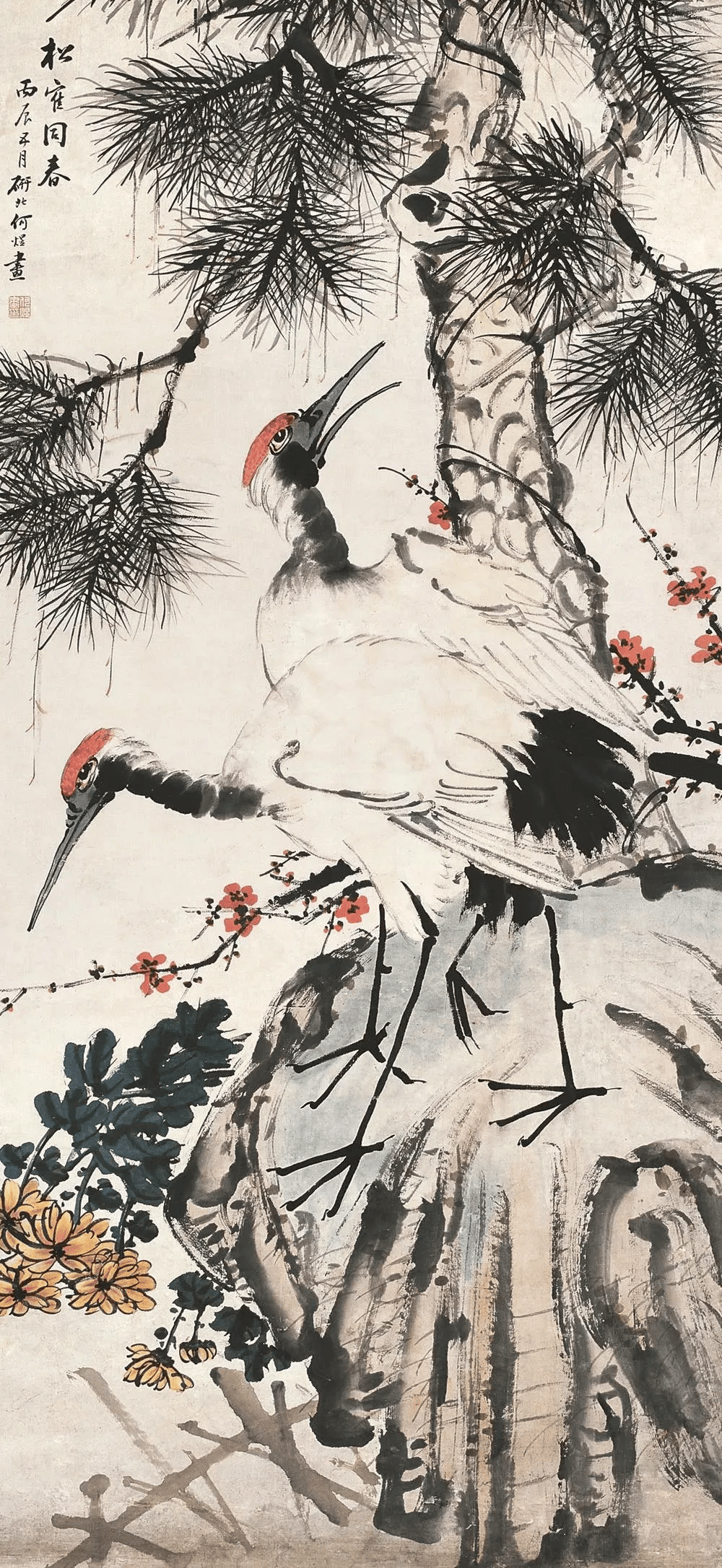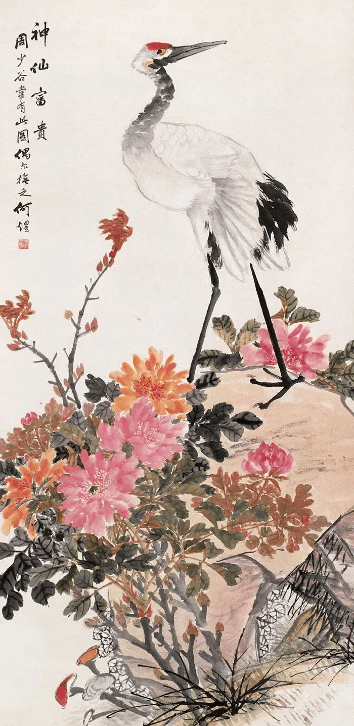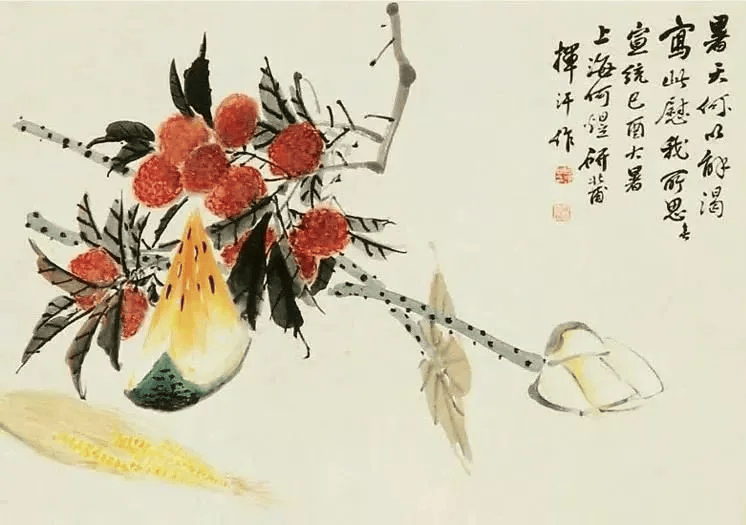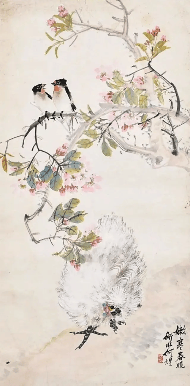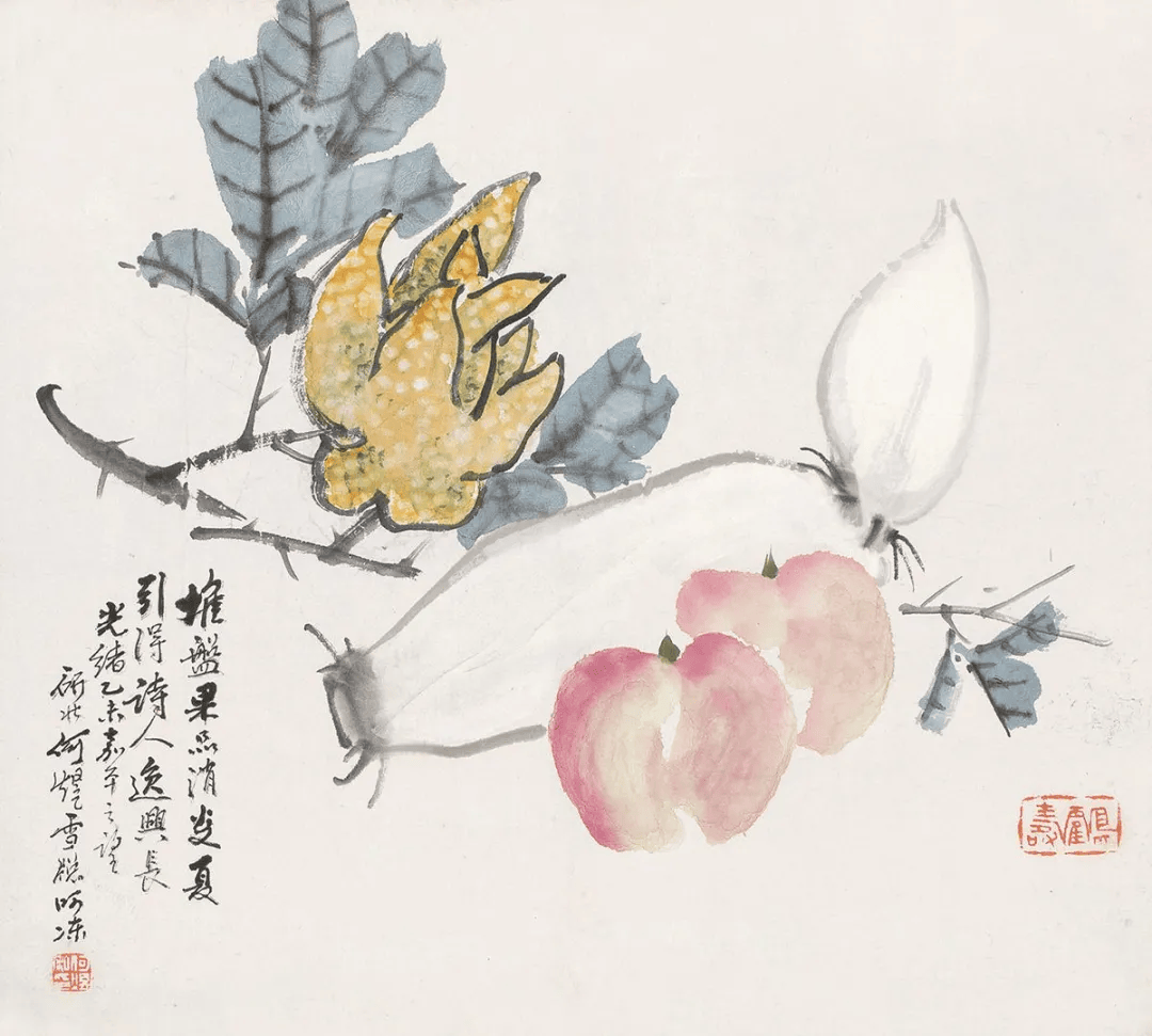 比如,他画中的牡丹、月季﹑玉兰﹑海棠﹑菊花等花卉,以及白菜﹑萝卜﹑南瓜﹑柿子﹑蟠桃﹑枇杷等蔬果,还有孔雀、凤凰、绶带鸟、白头翁等鸟类,无不具有浓烈吉庆色彩和生活气息。