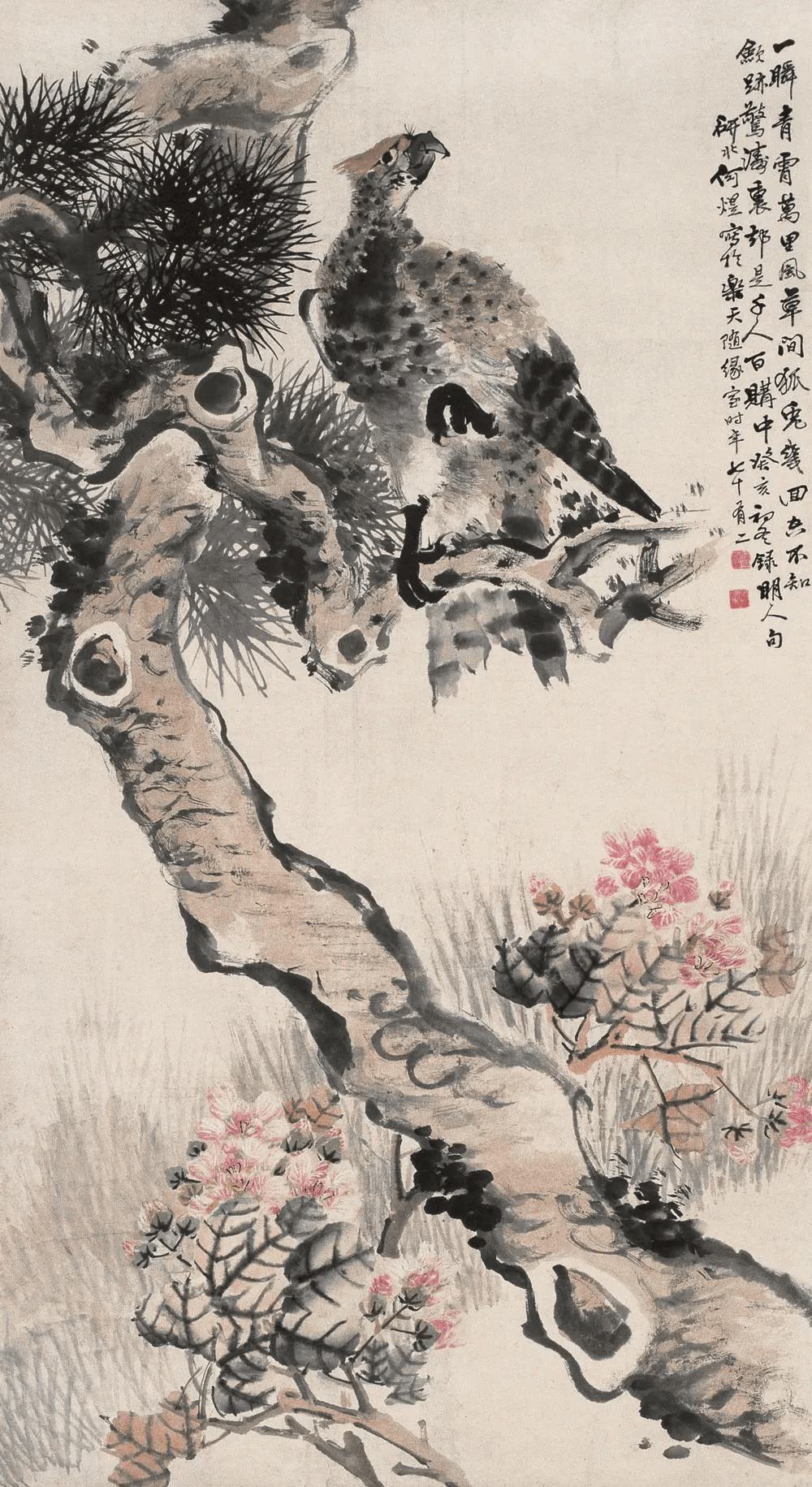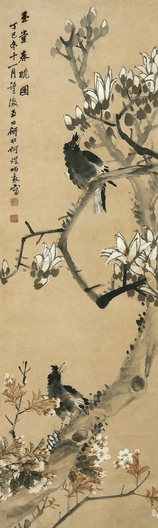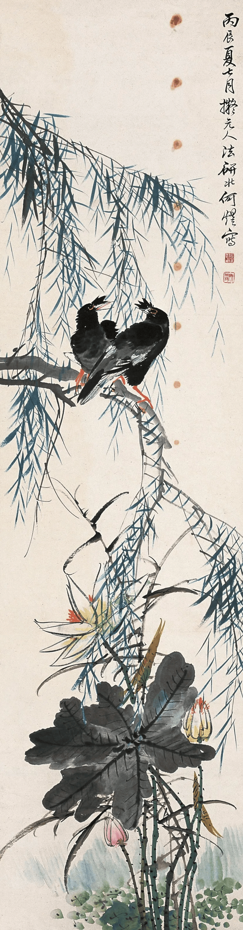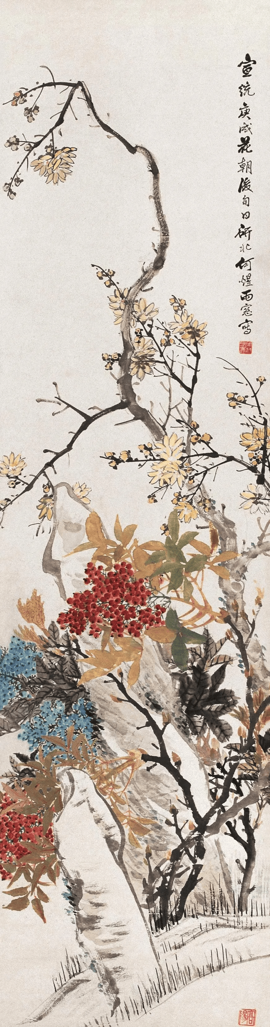 比如,他画中的牡丹、月季﹑玉兰﹑海棠﹑菊花等花卉,以及白菜﹑萝卜﹑南瓜﹑柿子﹑蟠桃﹑枇杷等蔬果,还有孔雀、凤凰、绶带鸟、白头翁等鸟类,无不具有浓烈吉庆色彩和生活气息。