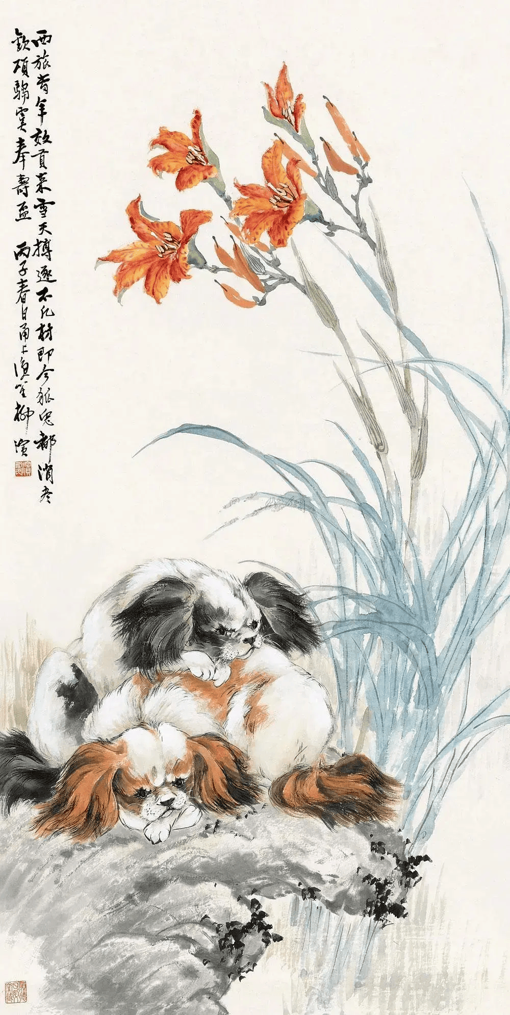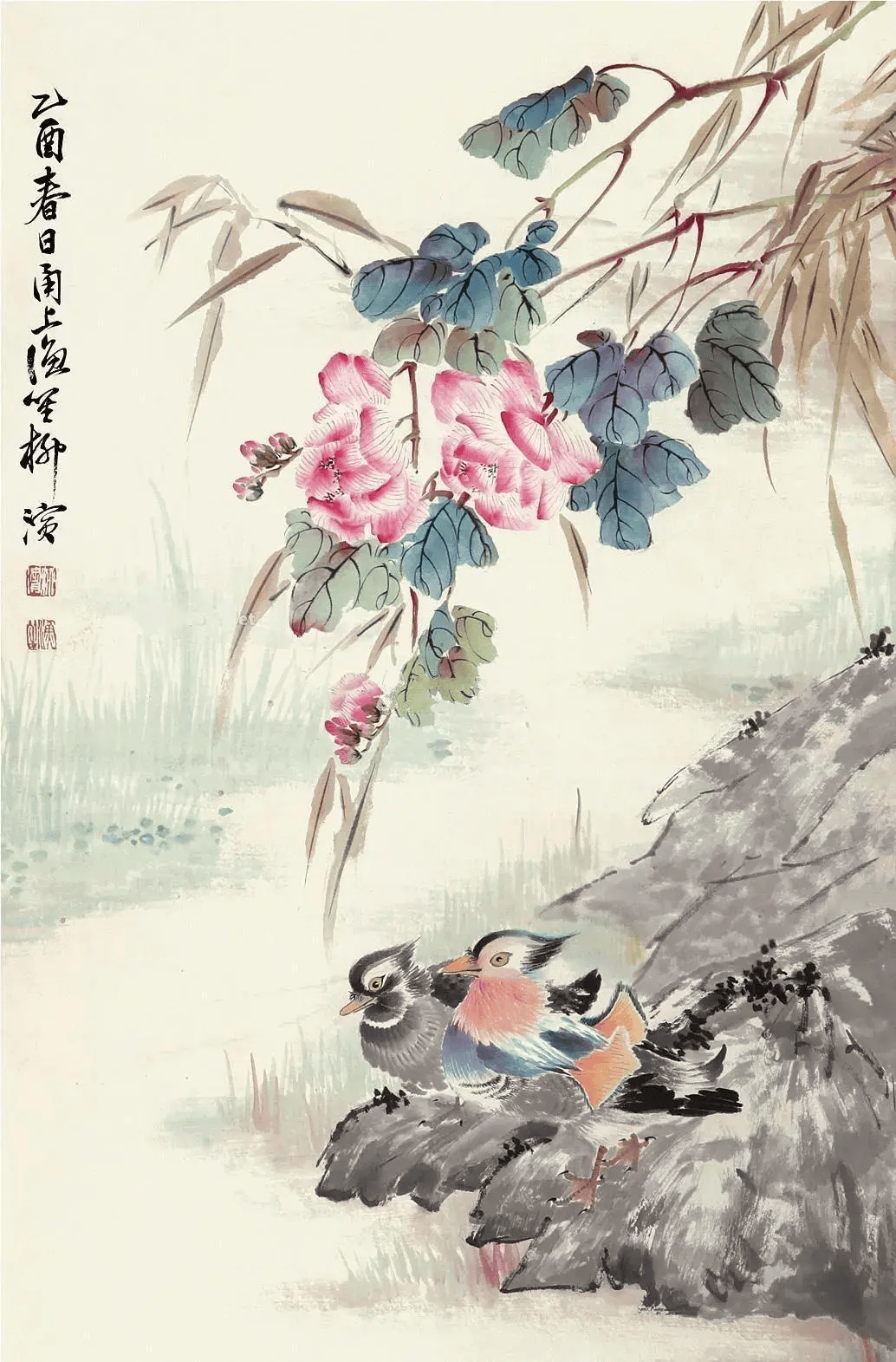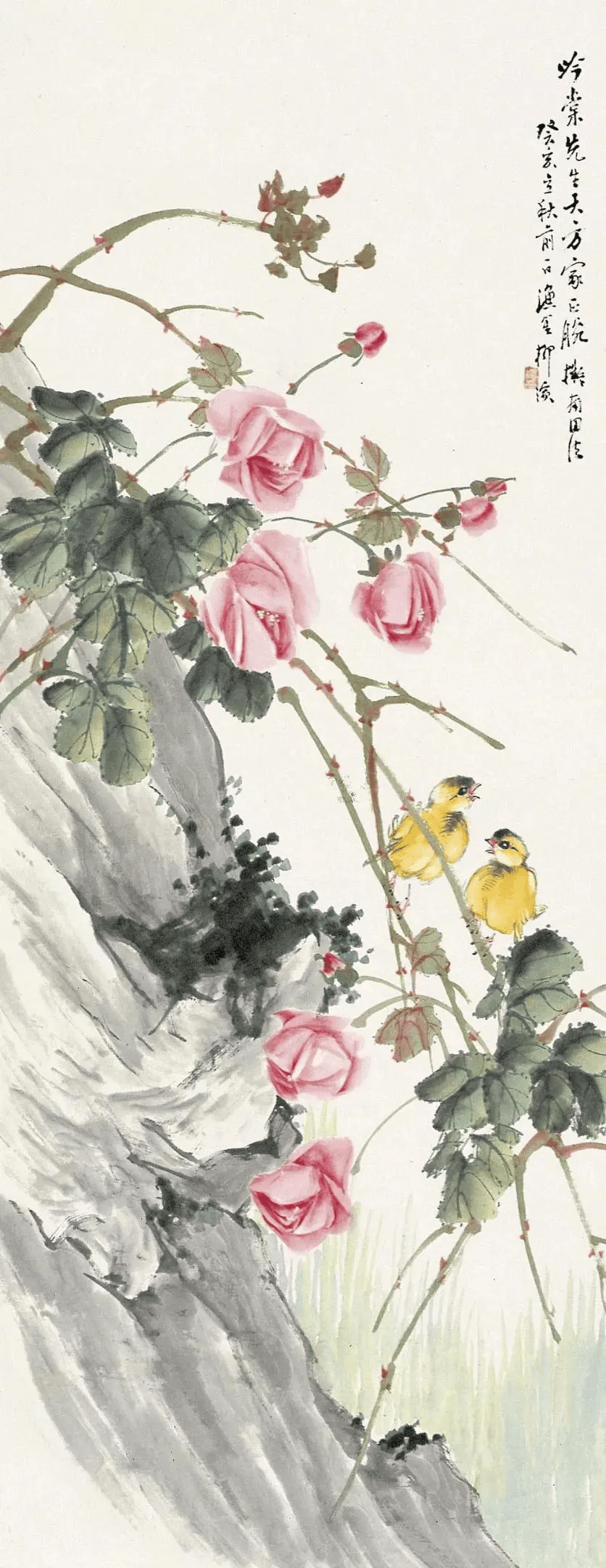 其画人物,宗华喦,参以钱慧安、任伯年;画翎毛、花卉、走兽,则学程璋(字瑶笙)。因二人风格十分接近,时人誉为“程瑶笙后一人而已”,并称“海上二笙”。