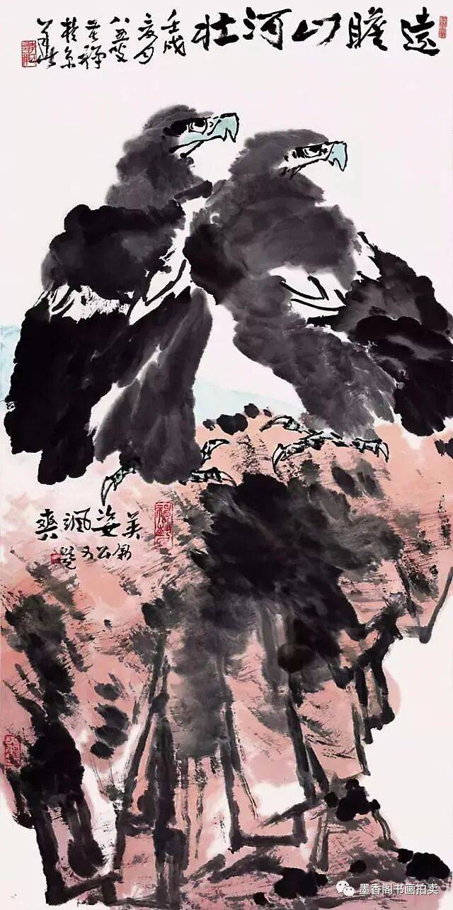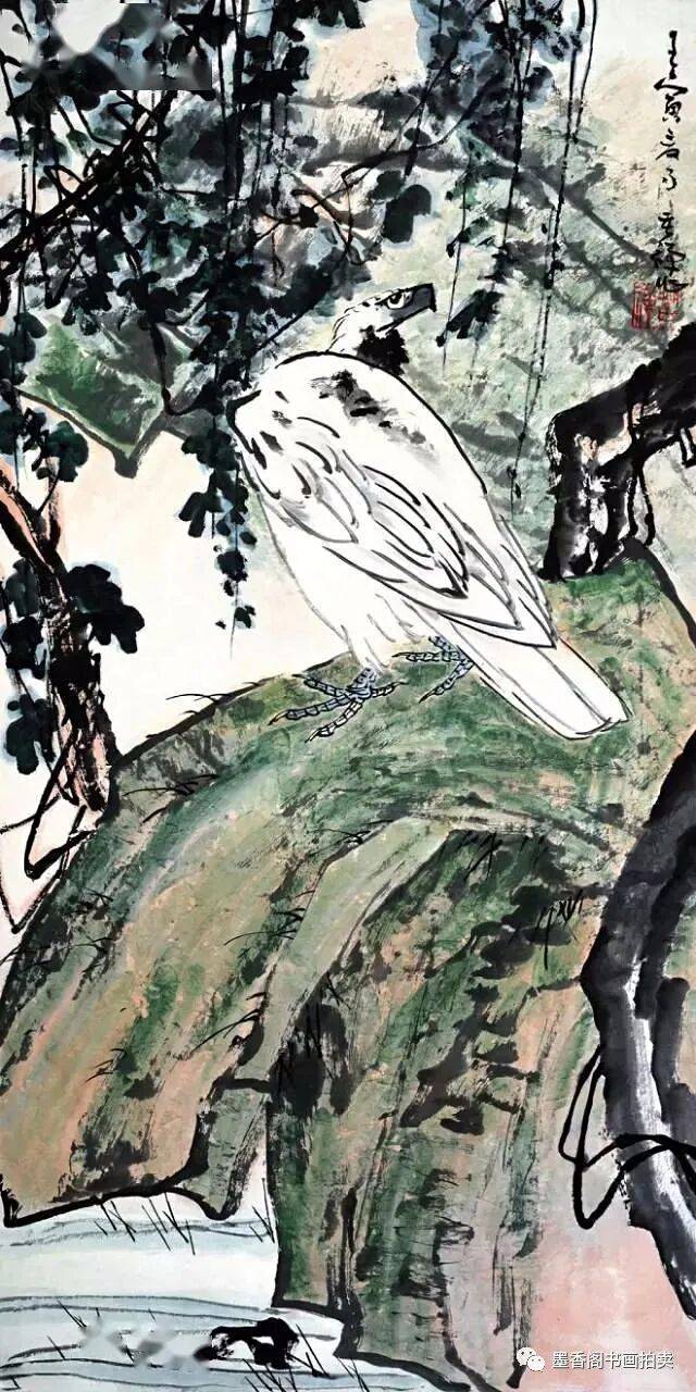 用大笔见小趣,这就是国画作品之中最讲究的一个地方。焦墨与重墨之间的打底,尤其是把这种艺术手法投放到鹰的身上,大气豪放,气势磅礴总是少不了的。细看他的作品,每一只鹰给人一种扑面而来的宏大气势,立于悬崖或者是立于岩石,都是给人一种惊心动魄的动态感。
