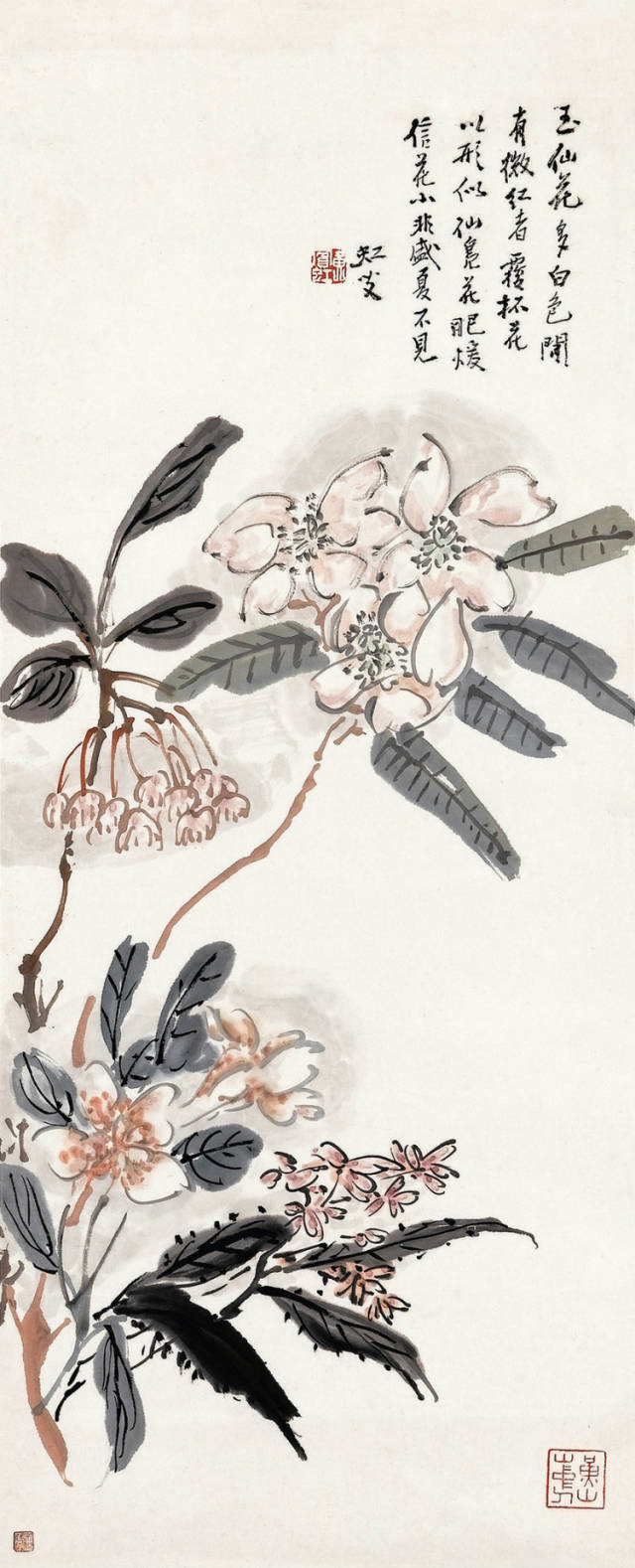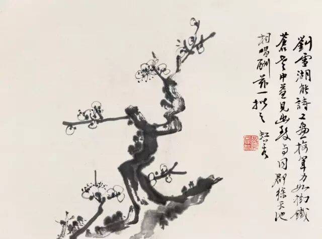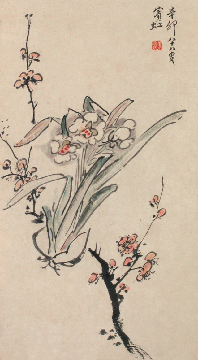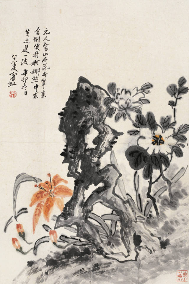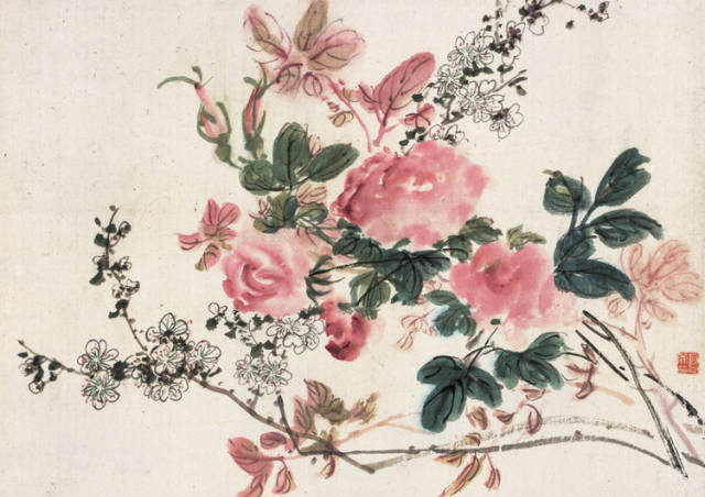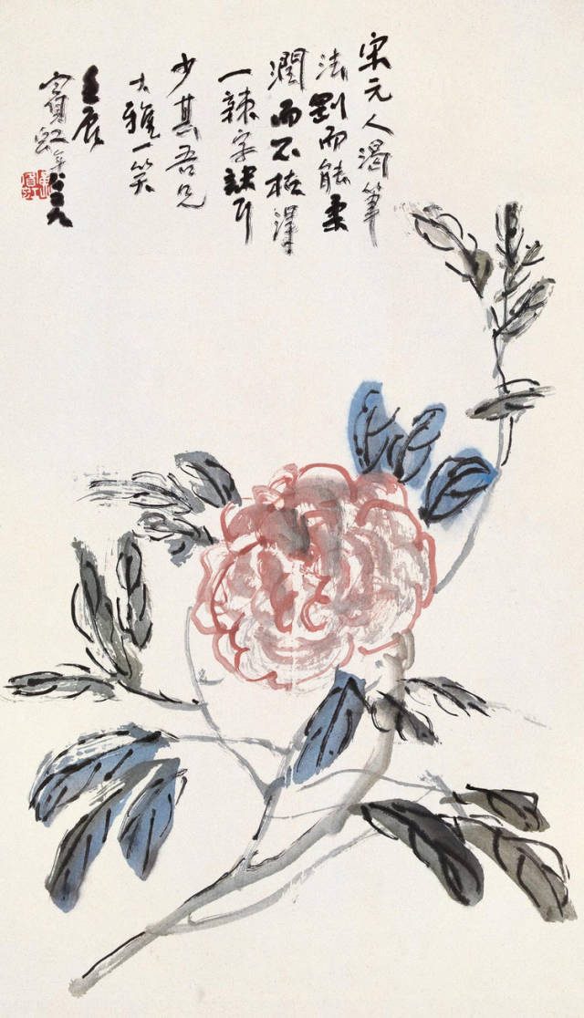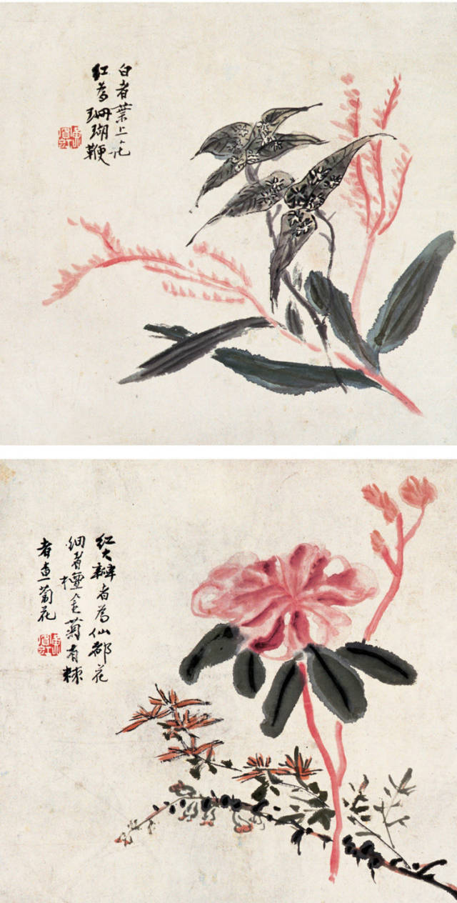 “点染写花”是黄宾虹花鸟画“探索”的一个重要点。钩花点叶,以点染之法着色,颇有“积(渍)墨”之美,古艳、丰富,平中见厚,厚而不失雅逸,一去前人涂抹习气。