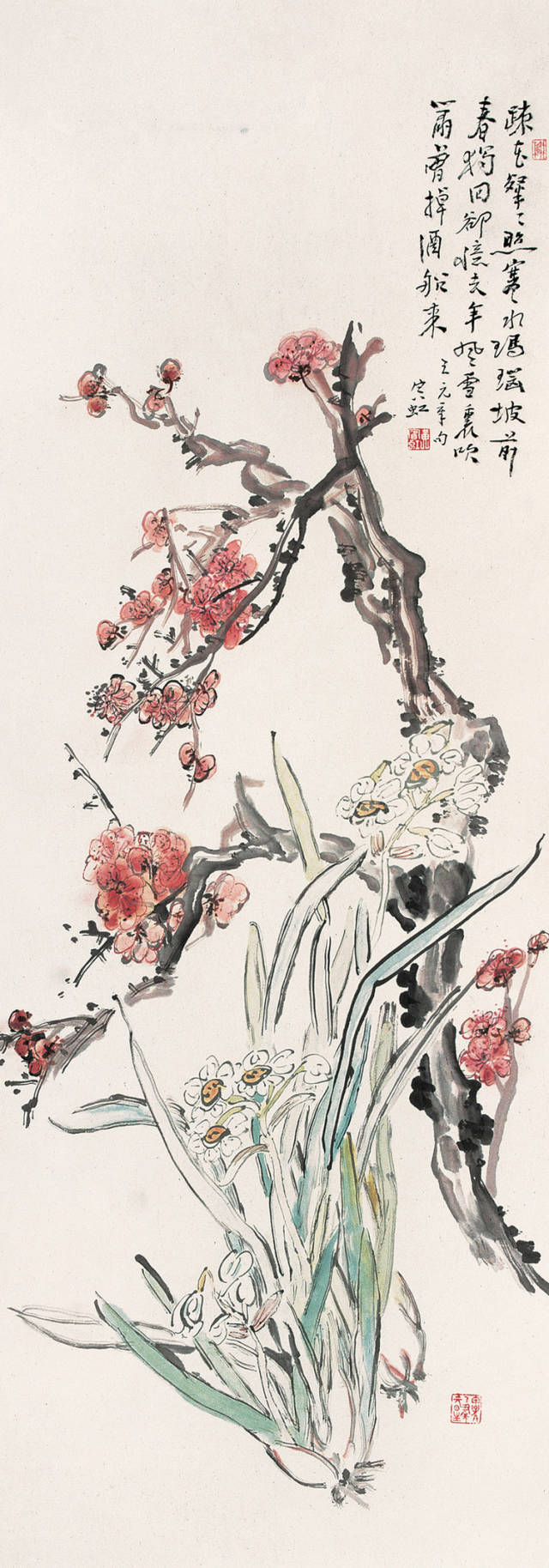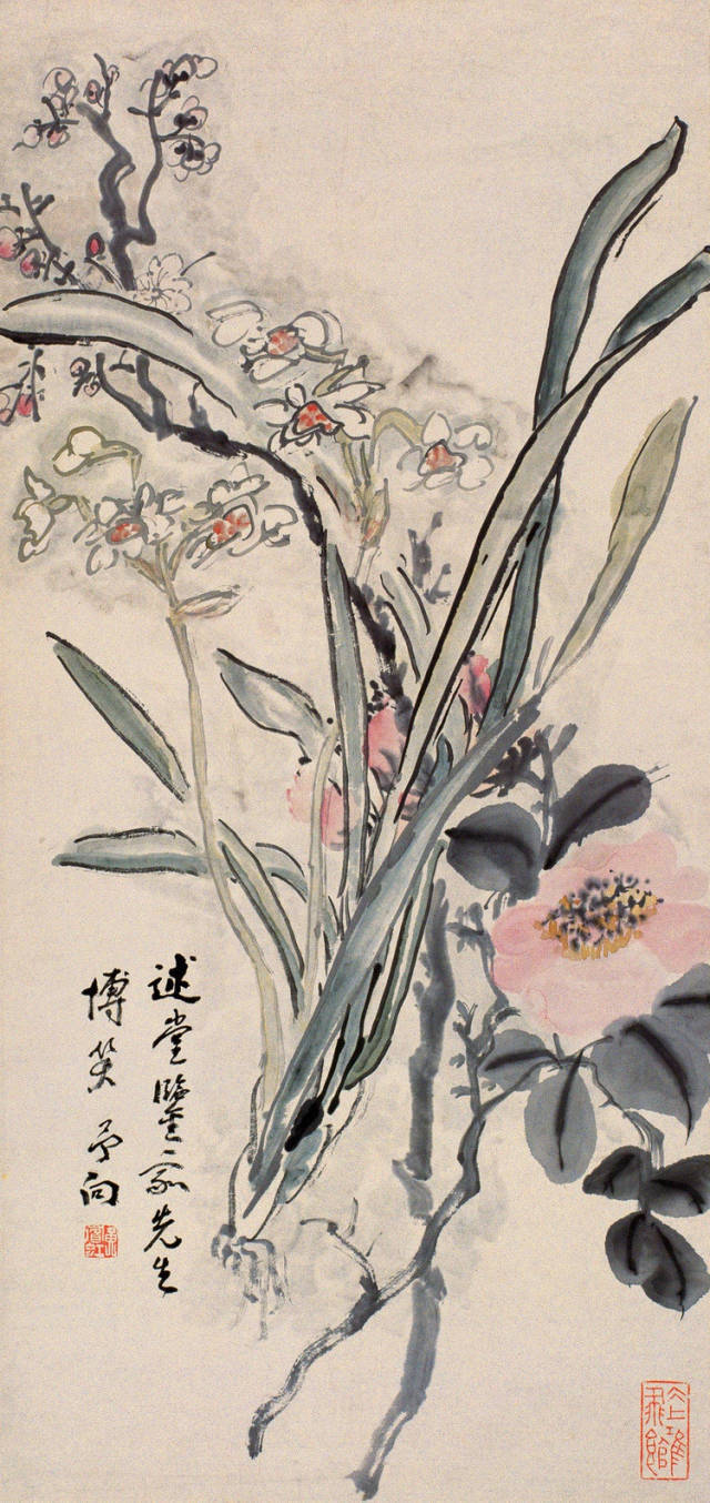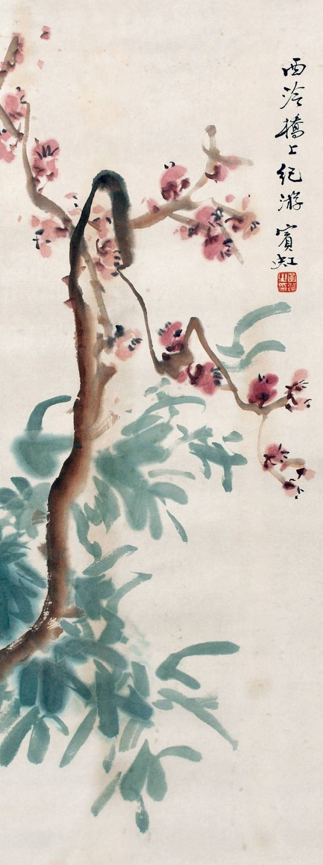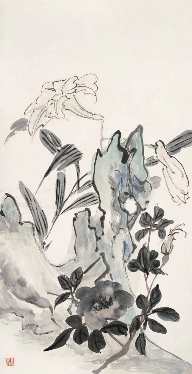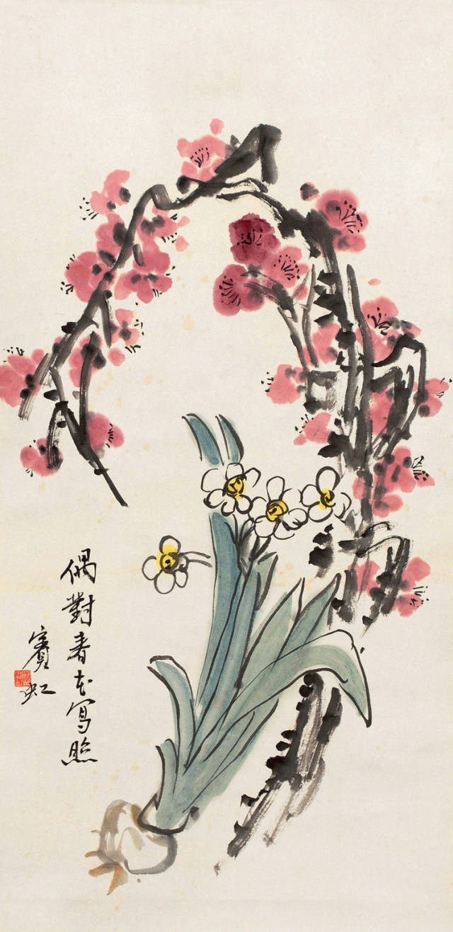 “点染写花”是黄宾虹花鸟画“探索”的一个重要点。钩花点叶,以点染之法着色,颇有“积(渍)墨”之美,古艳、丰富,平中见厚,厚而不失雅逸,一去前人涂抹习气。