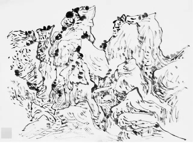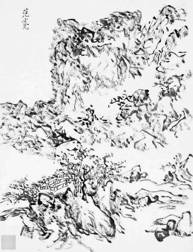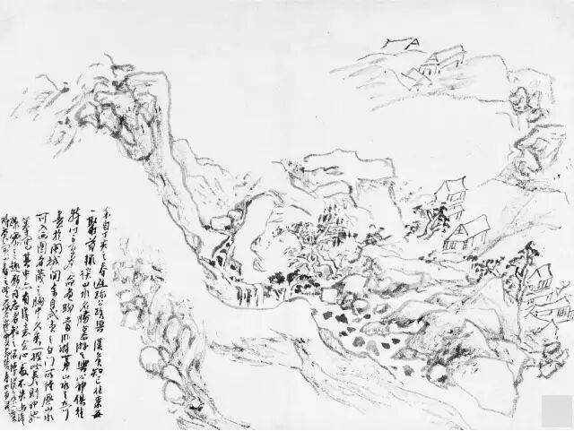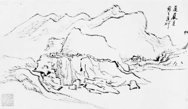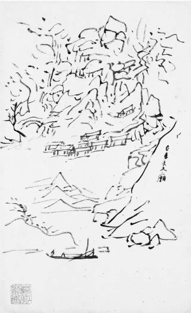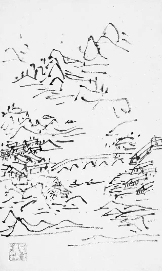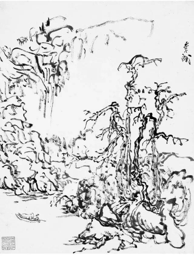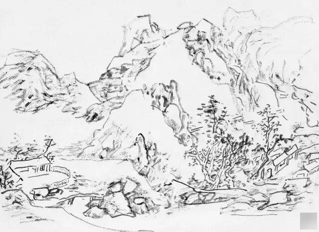 黄宾虹的临古画稿,多用简笔勾勒。如其所言,“观古名画,必勾其丘壑轮廓,至于设色皴法,不甚留意”。这种临摹古画时所用的速写式勾勒画法,即黄宾虹所谓的“勾古画法”,是他有关“出繁入简”的思考与实践。黄宾虹说“勾勒属笔,皴法属墨”,“画法之妙,纯视笔法”,“画法用笔线条之美,纯从金石、书画、铜器、碑碣、造像而来”,所以在他看来,“勾勒”用笔不仅源于书法用笔的标准,也通于自然造物的规律。