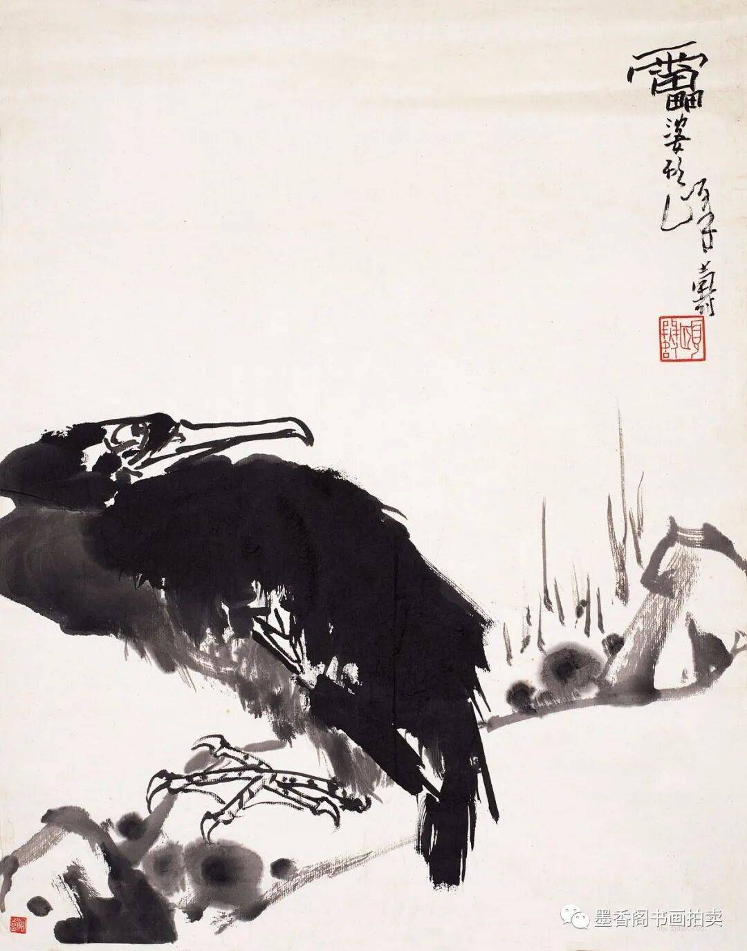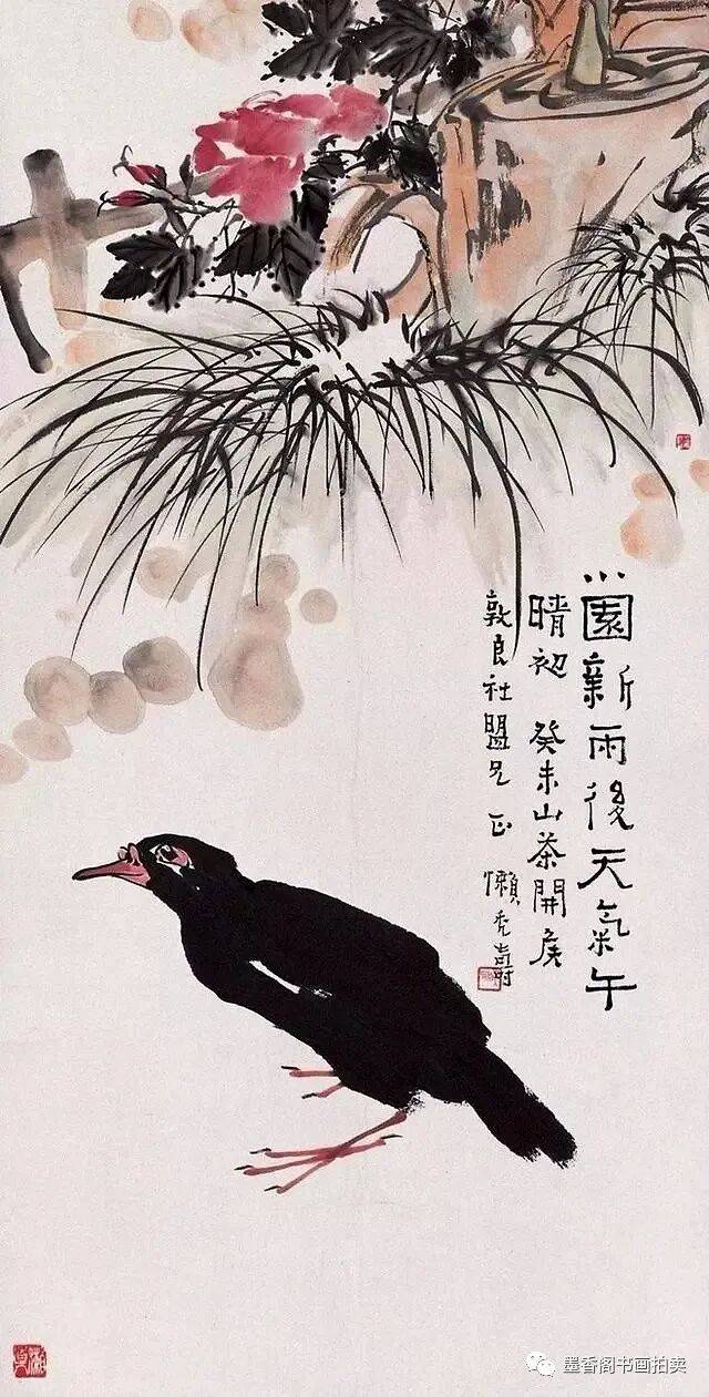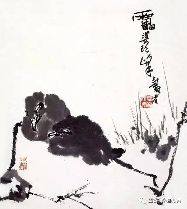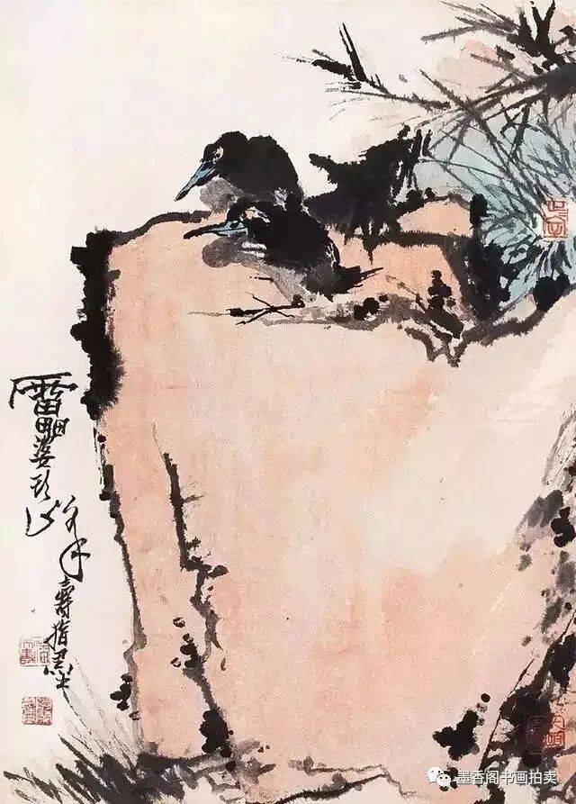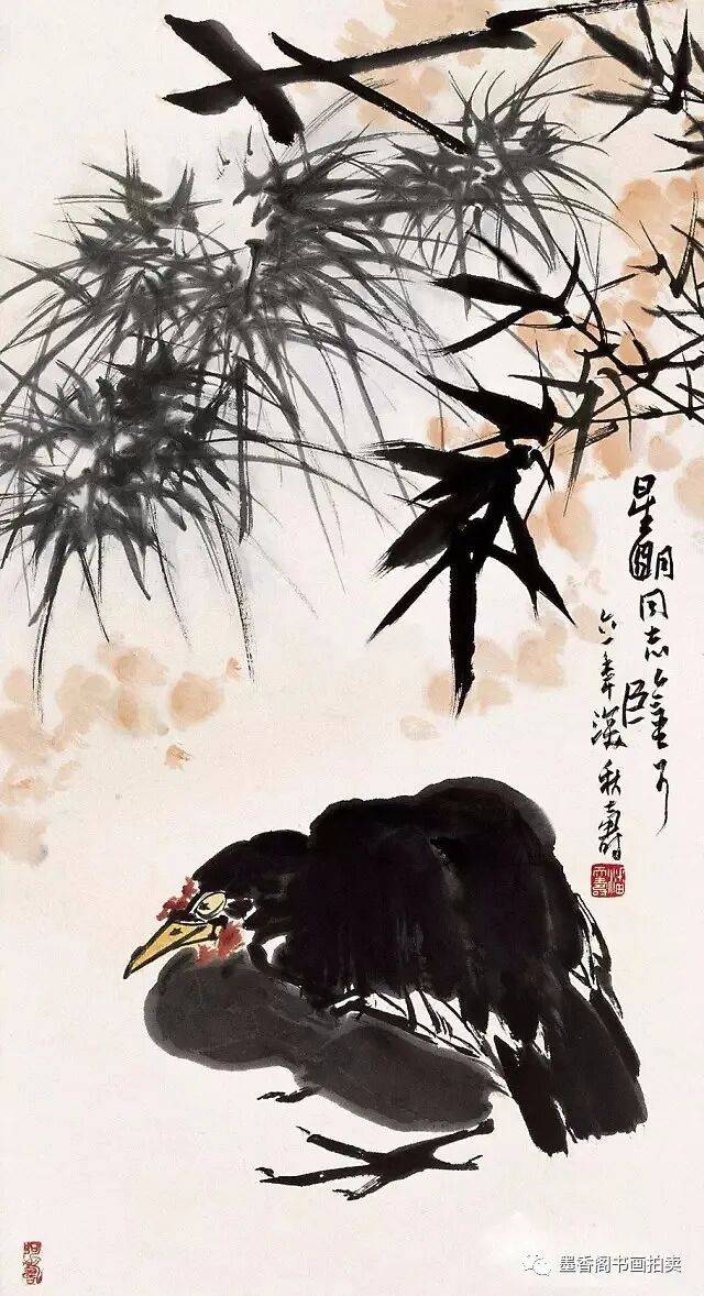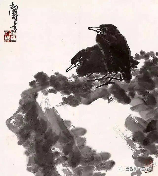 影响我比较大的是八大山人,八大主要是构图构思方面。我们讲八大的构图是很简练概括的,但是并不感觉简单化。今天我们来看,该减的就要减,该繁的也要繁,但是繁并不等于不简练,用繁的办法表达出简练概括,就像写文章一样,我们用三百个字就不要用三百零一个字,一千字就是一千字,也不能减到三百字,这都是简练概括。需要三千字的时候我们减到一千,再减就成简单化了,五百字可以减到三百字。一张画有多大,有多少笔墨,画什么内容,表达什么,都有区别。另一方面加上我是山东人的性格,简单概括并不等于简单化。吴昌硕笔墨是很好的,八大主要是构图方面简练概括,把他的立意表达了出来,徐青藤的画主要是潇洒泼辣,他把文人画往前推进了一步,过去的文人画不讲究泼辣,而他却相当地泼辣。大家所看到他画的葡萄潇洒且泼辣。