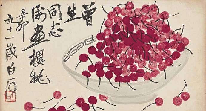 再来看齐白石大师的樱桃作品。齐白石无需多言,他在画坛的地位举世皆知,其名声甚至远播海外。齐白石最擅长的正是写意画,他的作品在拍卖市场上常常被抢购一空。他的樱桃乍看之下,可能会让人觉得不如蔡杰的写实樱桃那样逼真,但这正是写意与写实的根本差别——写意重在意境和情感的传达,而不是单纯的形态复刻。 这也说明了,我们普通观众对艺术理解的局限性。齐白石的樱桃融入了他对自然和人生的感悟,而蔡杰的樱桃,则专注于形态的真实呈现。两者的差异,不仅体现在艺术表现手法上,也体现在拍卖市场上的价值上。齐白石作品的稀缺性和历史地位,使得物以稀为贵,其名气之响亮,也让与他相关的画作自然拥有极高的市场价值。