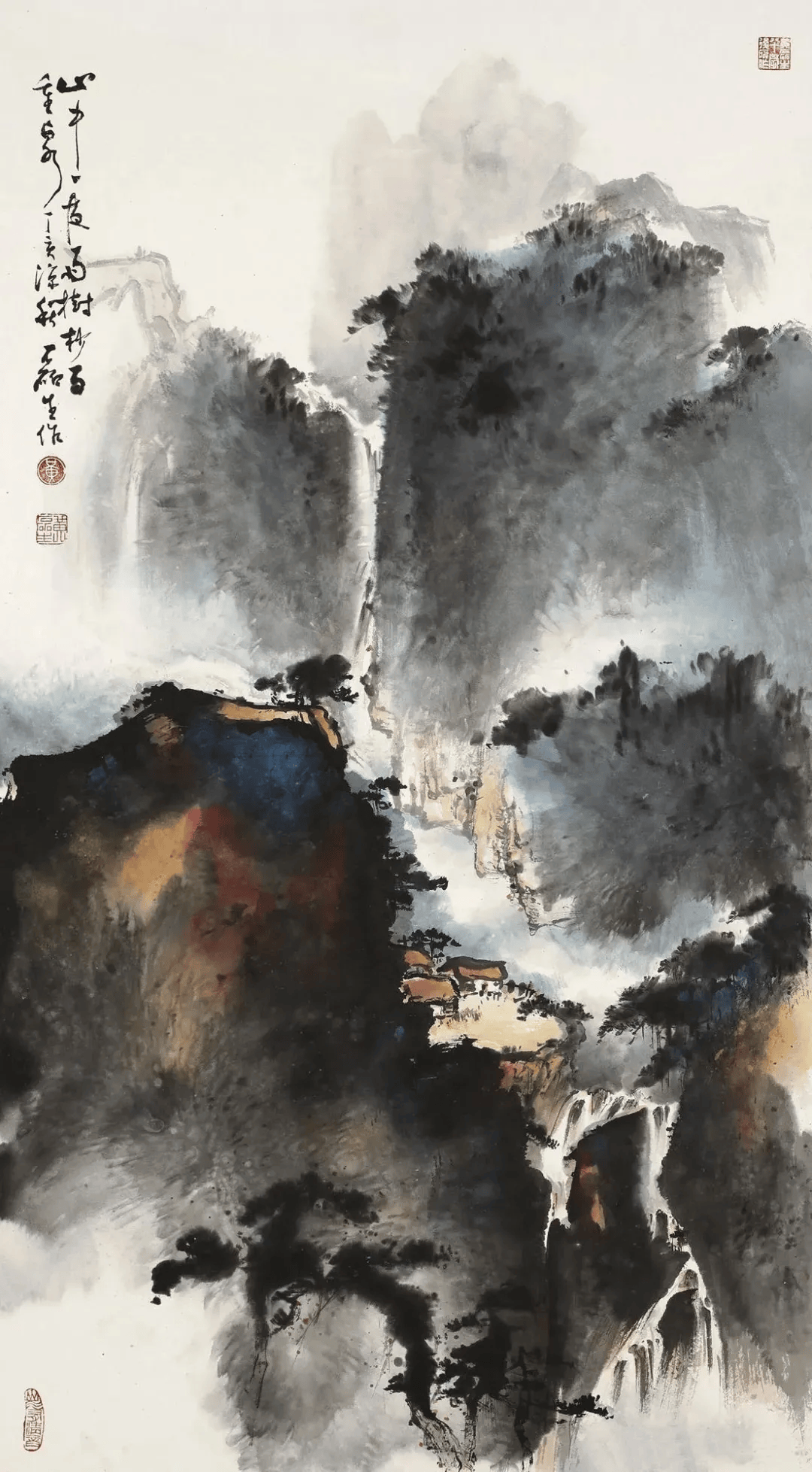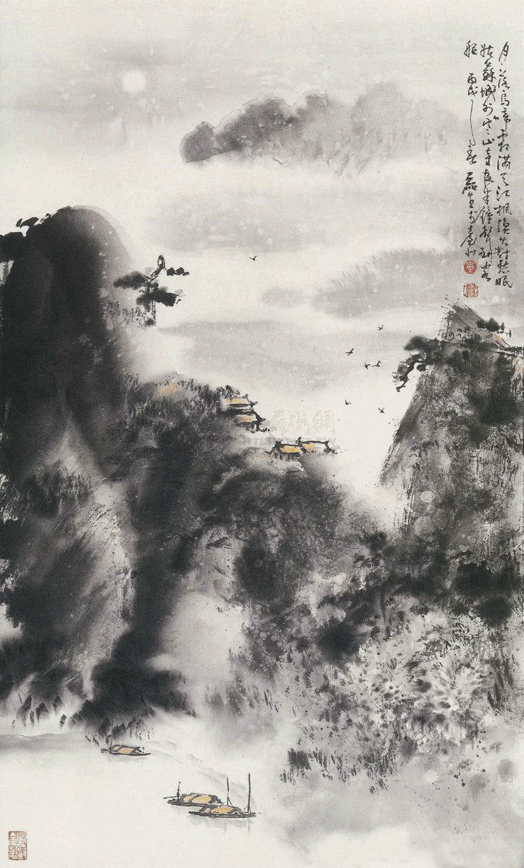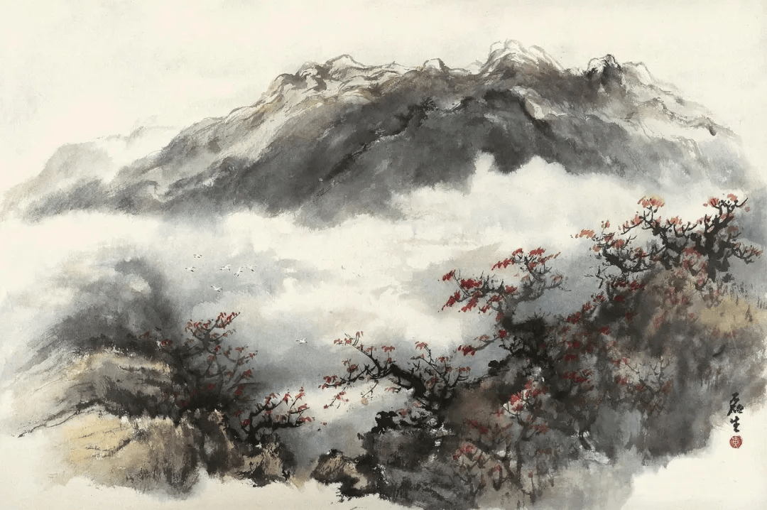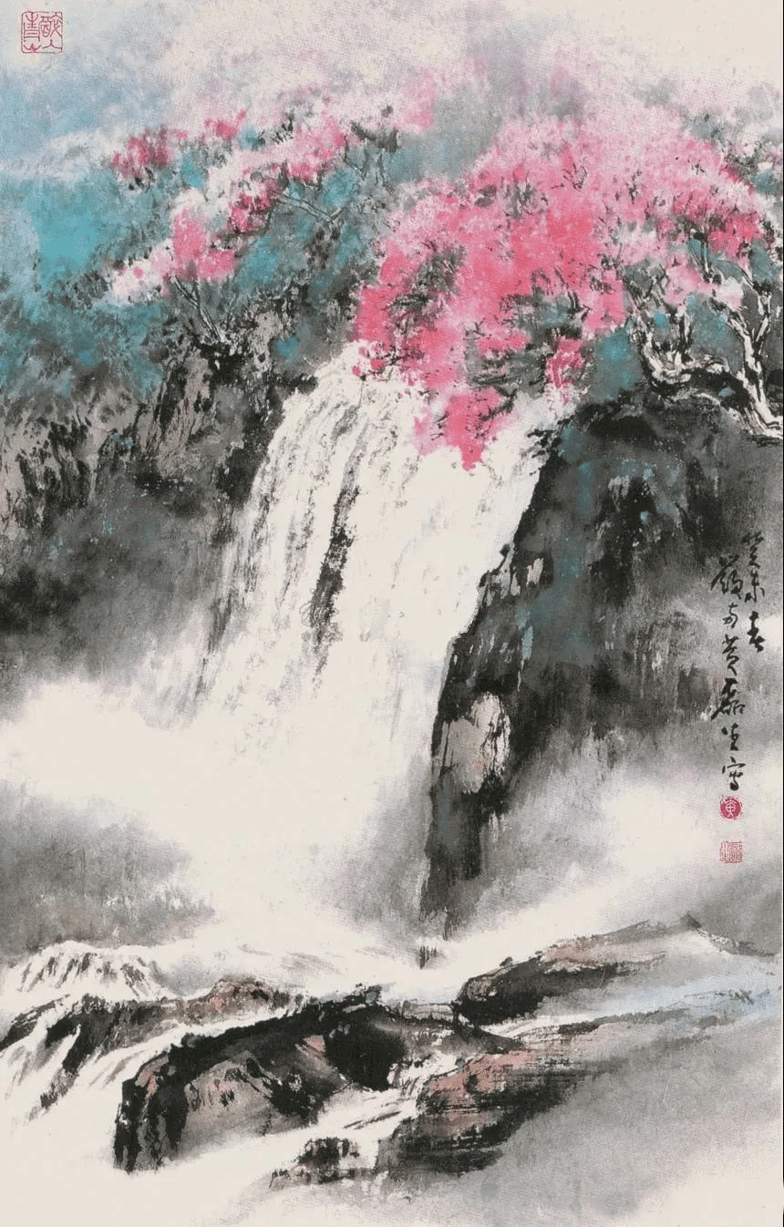 他的山水常常运用斧劈被、干笔、渴笔,用笔比较碎、硬,横砍竖劈。同时还融入了西画透视、渲染、空灵的质感,使柔润的色彩与豪迈刚健的笔法融合,显现出“墨卷波涛、笔缩云烟”之妙。