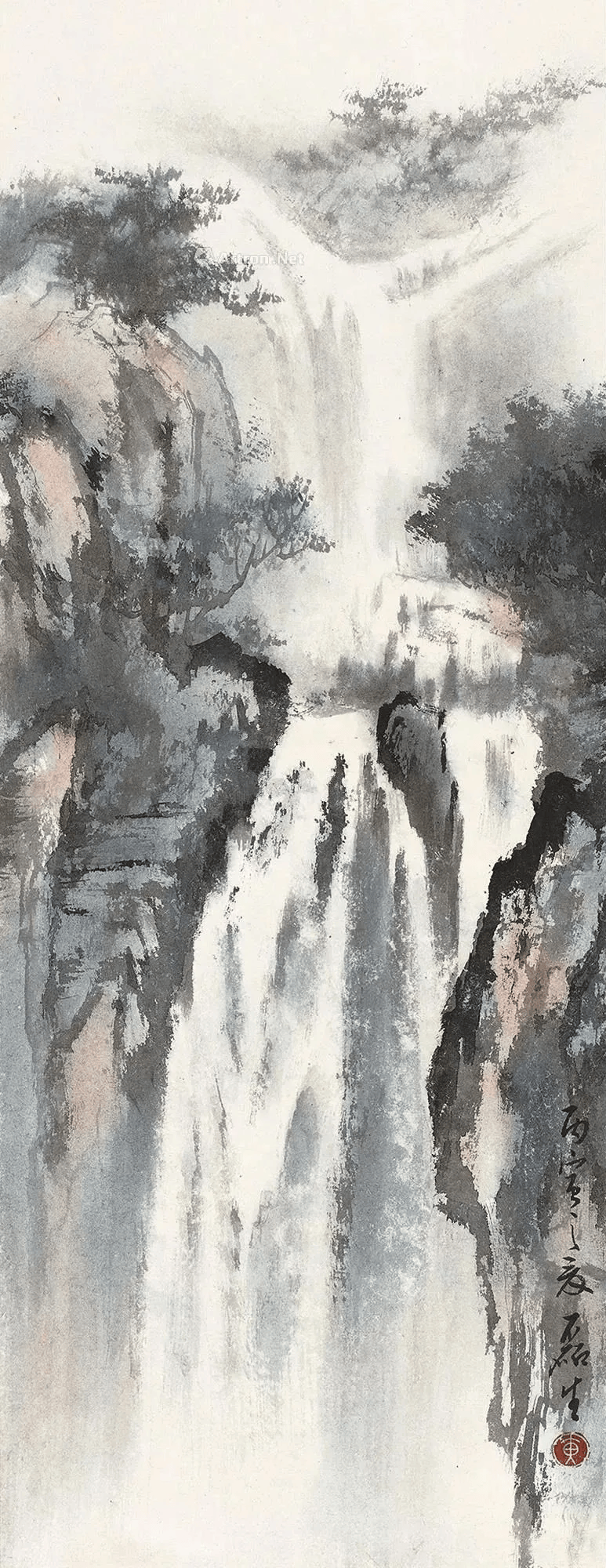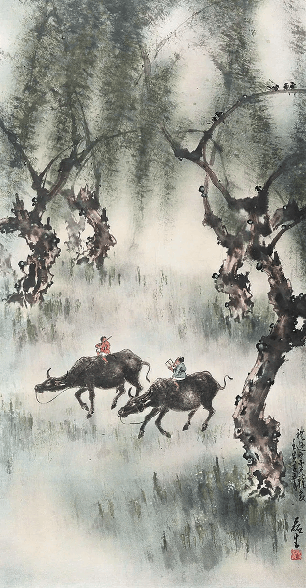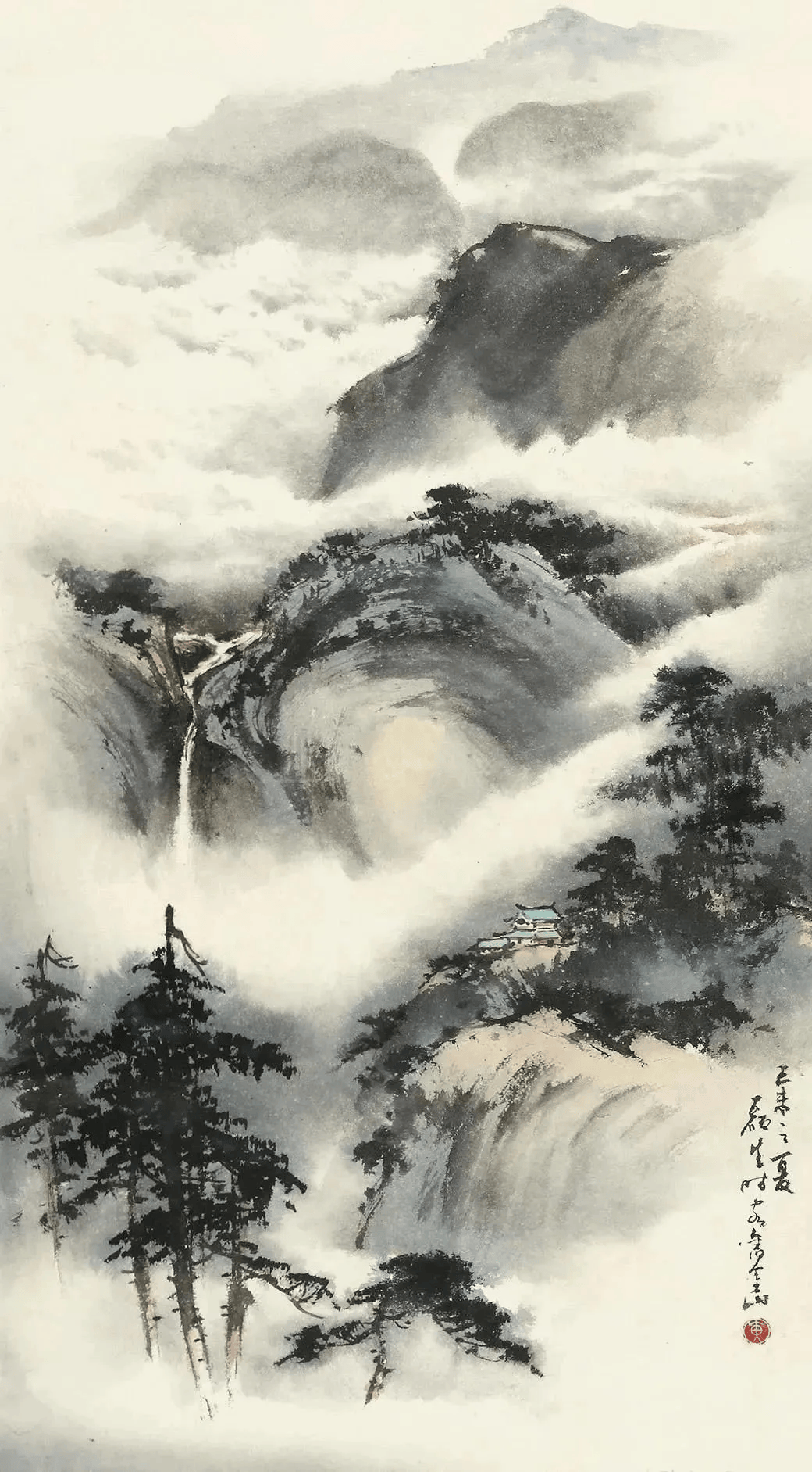 他的山水常常运用斧劈被、干笔、渴笔,用笔比较碎、硬,横砍竖劈。同时还融入了西画透视、渲染、空灵的质感,使柔润的色彩与豪迈刚健的笔法融合,显现出“墨卷波涛、笔缩云烟”之妙。