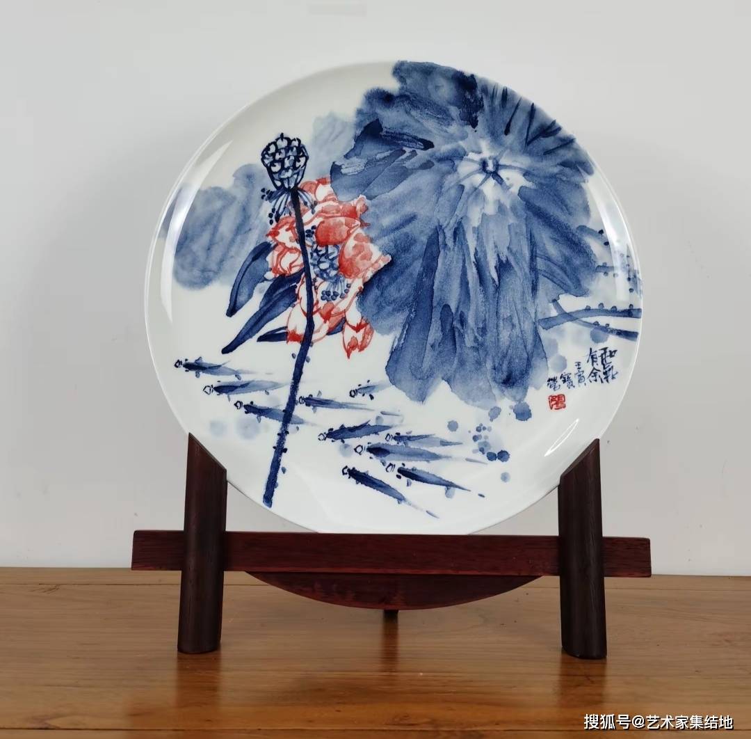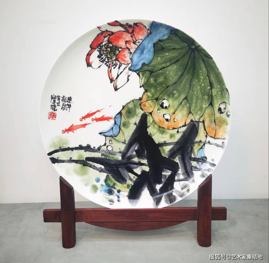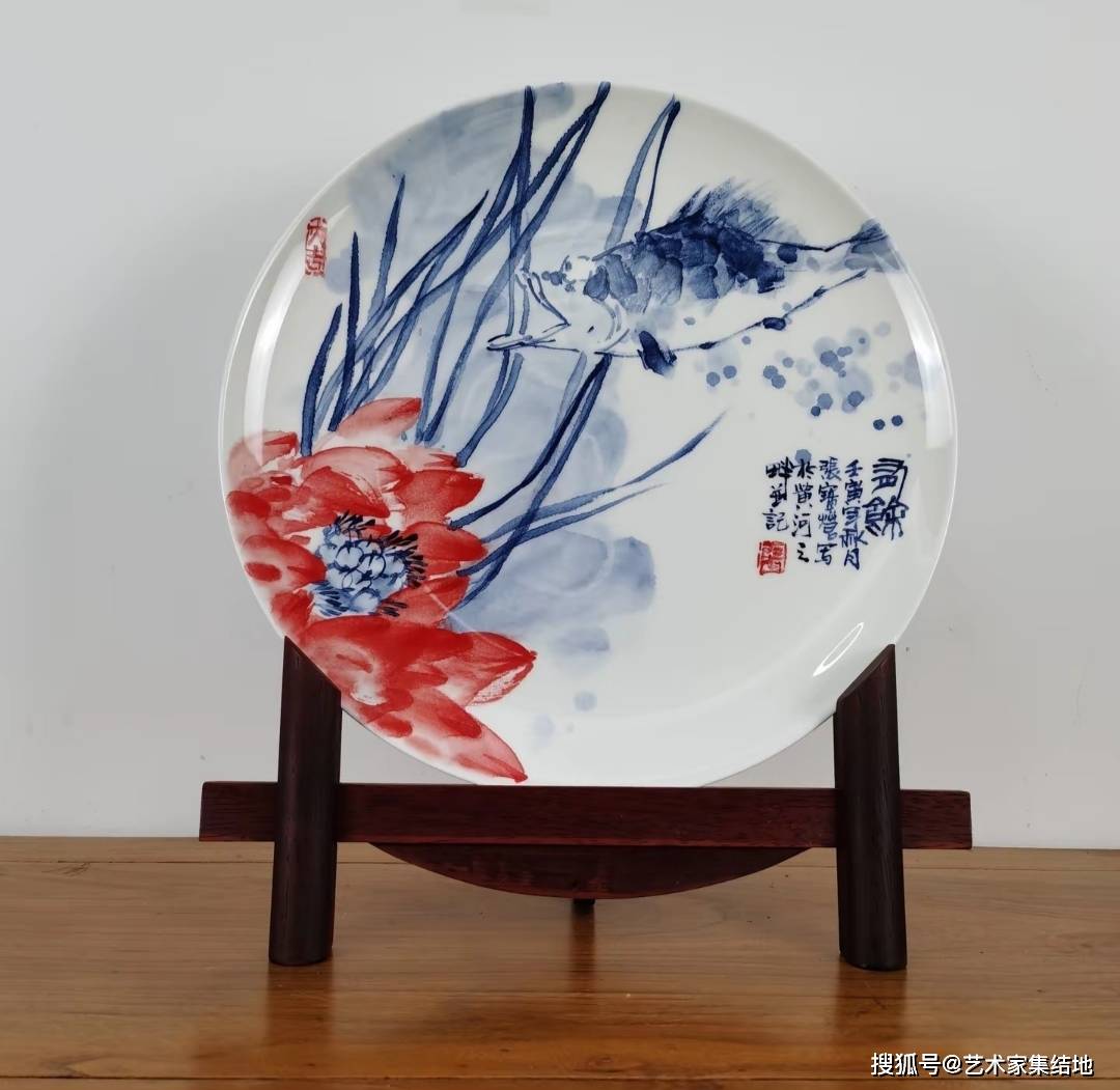 张宝营的瓷盘画,首重“笔墨传情”的艺术价值。他延续写意花鸟“以意为先、以墨为魂”的创作理念,将宣纸作画的笔墨韵味精准复刻于瓷面。不同于宣纸的晕染特性,瓷盘光滑釉面对笔触掌控要求极高,他却能以浓淡干湿的釉色变化,勾勒出牡丹的雍容、荷韵的清雅、兰草的坚韧。其代表作《胭脂牡丹》瓷盘,胭脂色花瓣层次分明,釉色浓淡过渡自然,尽显“国色天香”的华贵;《荷塘清趣》则以淡墨绘荷叶、浓墨点荷花,蜻蜓点水的灵动姿态跃然瓷上,寥寥数笔便达“意尽形全”之境,将传统国画的写意神韵与瓷质的温润质感完美交融。