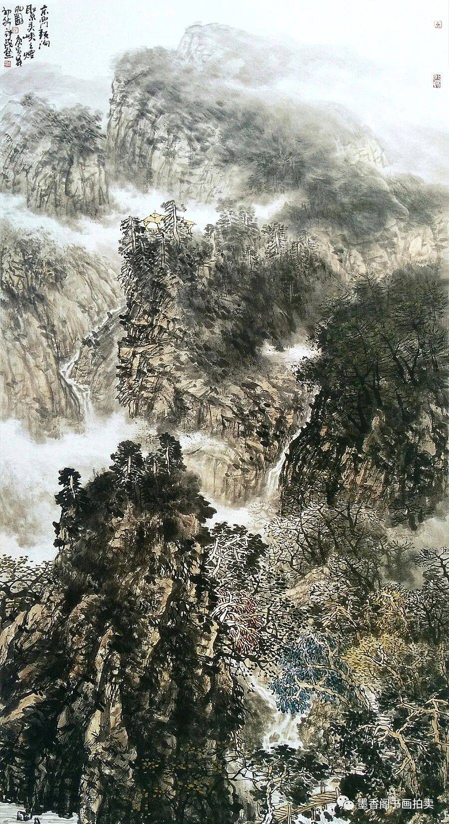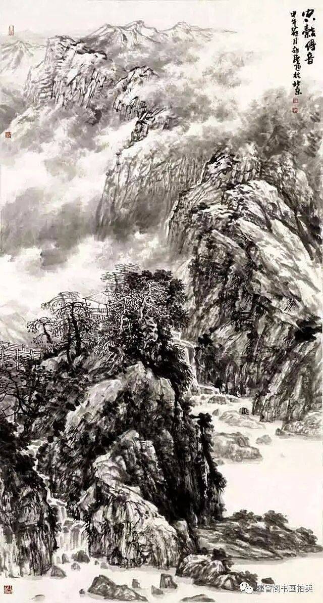 在传统的中国画中,表现山石是通过勾、皴、点、染这四个主要的手法来完成的。勾就是用线条勾画出山石的轮廓、形态及透视的变化关系等等。线条这东西在中国画的用笔手段之下能产生千变万化的不同,它可粗可细,可长可长,可光滑可毛涩,一波三折,或刚劲有力或蓬松飘逸,线条的多变不是用语言可以表达清楚的。