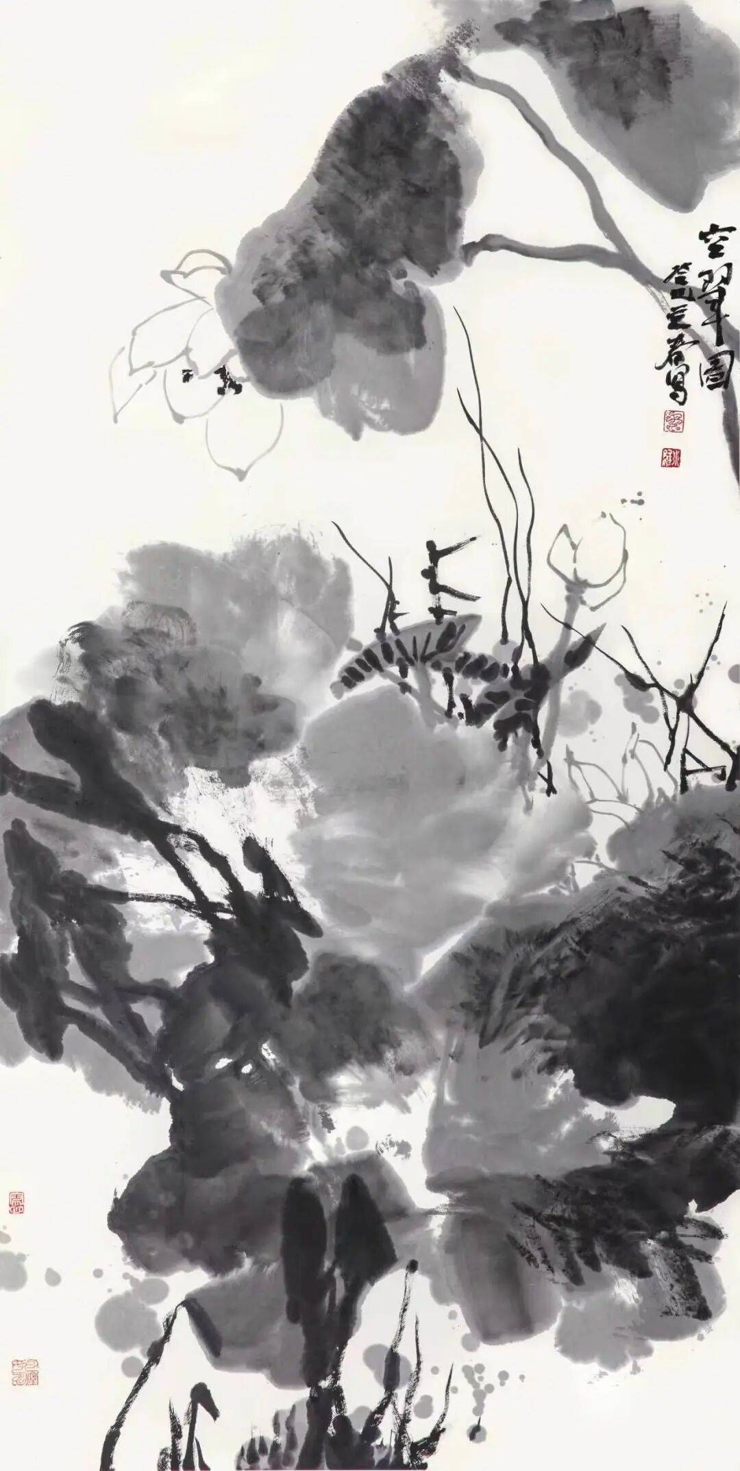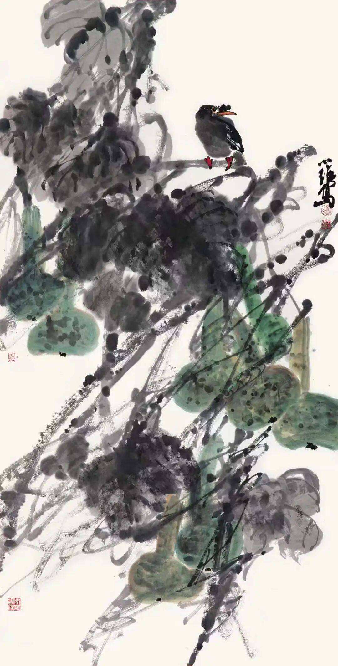 以书入画,笔力为骨。王小维精于书法,这为大写意提供了最具诗意的构建。大写意的本质,是以书法的笔意来写“意”。线的质量、点画的节奏、结构的开合,无不与书法同源。观其藤蔓的缠绕、荷梗的挺拔,可见篆籀笔意;看其枝叶的穿插、苔点的铺排,又见行草风神。以书入画,方能笔中有物,这是大写意不可移易的根脉。