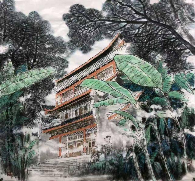 我爱他那幅《李泽厚故居图》。芳草萋萋,远山如黛,设色古朴雅致,仿佛新雨过后。泼墨写意的山水留出三分不曾言说的深情——这份深情,我想我是懂的。二〇〇六年,张奇老师去中国美术馆举办画展,李泽厚观之爱极,欣然题字,勉励有加,并提议他创作湖湘名人故居系列。正是这个提议,让他坚持至今。这份情感如今在水墨之间彰显得淋漓尽致。大写意的山水带出一种大开大阖的古拙风韵,唯独水塘边的青石板和旁边的苍苍古树,用工写兼具的笔法仔仔细细地画了出来。“过尽千帆皆不是,斜晖脉脉水悠悠”,那条青石板就那样俏立在水塘边,就着远山余韵悠长。落笔者仿佛披衣独立,期待风雨故人来。这一条青石板,画的便是这样一份等待——更是张奇老师寄托的情思:走尽千山万水、看淡风月之后的故人绵密心事。一支笔,三两墨,我想他细细描摹这青石板的时候,也应当想象自己站在上面,等待李泽厚先生的归来。两人临风把酒,天南地北地海聊——聊往事,聊家乡,聊得失,聊写意,聊梦想;也会骂天地,骂世事,骂古今;更会说风流,说韵事,说女人。艺术家的风流不着一字,都在水墨里洇开,比泼墨生动,比点染有趣。