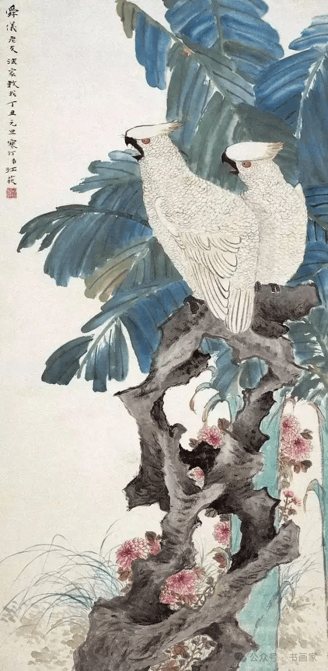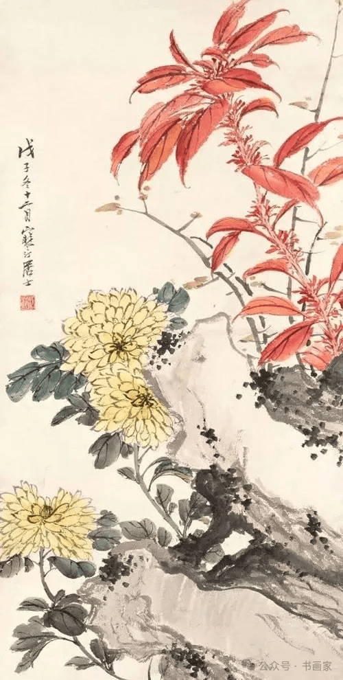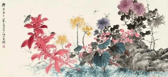 江寒汀的菊花以干湿浓淡的墨色变化为核心,通过笔墨的晕染与线条勾勒营造层次感。他巧妙运用墨色明暗、虚实和远近关系:近景菊花,墨色浓重,色彩鲜艳,花瓣形态饱满立体,细节刻画细腻(如花瓣纹理、叶脉走向),体现所画菊花的精致;远景菊花,墨色淡雅,色彩柔和,以写意笔法勾勒轮廓,营造朦胧悠远的意境,与近景形成对比。