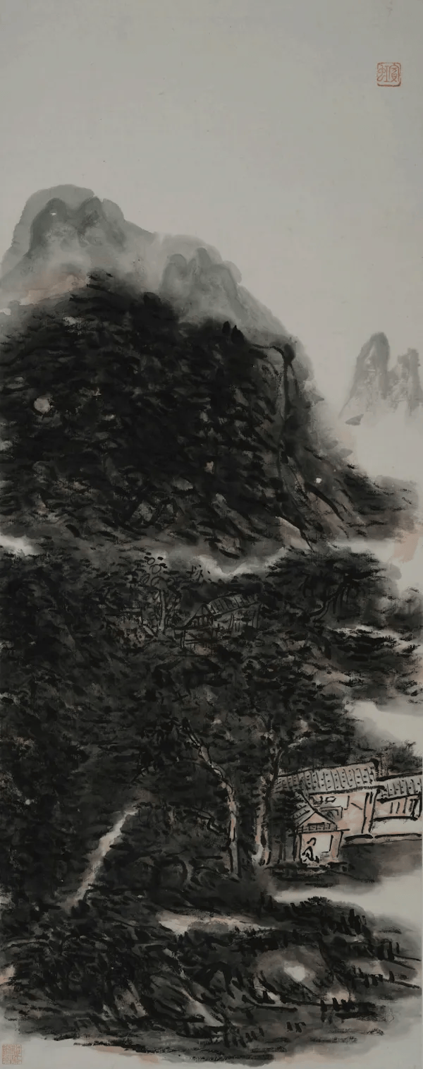 山水画是用毛笔和水墨来书写胸中丘壑,在用笔、用墨的书写中,笔墨会自然产生不同的形态,不同大小、不同层次、不同虚实的黑白效果。这种笔墨形成的整体黑白效果对“势”产生较大的影响。就龚贤、黄宾虹和李可染为例,他们的表现方法都是比较偏重于积墨,层层积染所产生的黑白效果与“势”的形成,大多是一种整体性的,边沿有明显的起伏变化。从“势”上讲,它的黑与白相互包的很紧,阴阳相生,很有分量感和力量感。一个大的黑形和一个空白形造成开合呼应的关系,整体的黑白是根据画面内容的需要来定。如黄宾虹的山水画作品《夜山》,整体看上去上下一整块黑山,给人产生一种挤压聚合效果以及形式上的张力与凝聚感,他在山体的外形与山川气势结构中,运用了不求多变的方法,不刻意去追求画面的具体丘壑安排与章法的经营,而是将注意力放在了画面大的黑白整体的气势上,去突出表现那夜山的浑囵。所以山中虽有溪壑纵横、林木聚散、泉流迭荡、道路往来、峰峦掩映,然而这一切都隐伏在了山体的黑色整体之中,这或许是黄宾虹在“势”的笔墨表现上最为精彩绝妙之处。