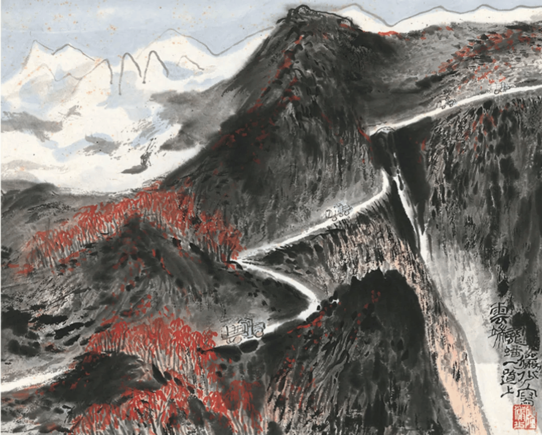陆俨少的作品与弘仁分割方式不同的是,他是用一种粗细变化的波折线的笔墨形式来分割画面的,使分割形成主宾呼应的章法,从较宽的波浪线到细微的波折线,又从宽舒的留白到细窄的留白处,都形成了“势”的一种有力的把握。包括线条的方向、宽窄、长短、上下、左右、侧正等对“势”的风格形成了微妙的变化。如果说线与点的分割,对弘仁的画在“势”上形成了一种静态的美,那么陆俨少的线与点的分割则在“势”上,则形成了一种动态的美,这是他们因笔墨的不同,所形成了山水画“势”上风格追求的不同。