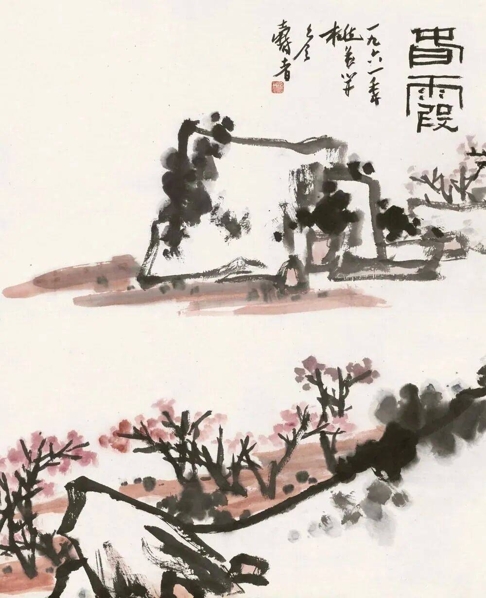 新中国成立后,潘天寿进入创作全盛期,艺术语言更加自由奔放,笔墨趋于凝练苍古,构图更大胆险绝。他深入雁荡山写生,将自然实景升华为具有现代结构美的艺术图式。代表作《梅雨初晴》(1955年)以空勾巨石配野卉,刚柔相济;《雨后千山铁铸成》(1961年)则以焦墨重线塑造山体,如铁铸般坚实,充满力量感。这一阶段的作品不仅延续了“金石风骨”,更注入了对生命与自然的深沉礼赞,达到“笔简意远、气韵天成”的境界。