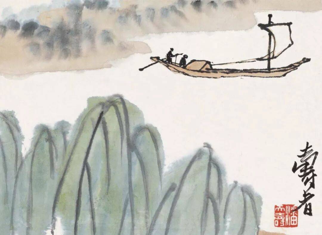 潘天寿的小品,韵味隽永,笔筒意深,是他的情感率直流溢的结果,《晴江晓色图》的画面形象几乎减少到最大的程度,江的对岸高山横立,山石的表面不细勾分面,只靠色彩的浓重表现向背明暗,岸边蒲苇晃荡,近处只留几片墨迹,两个人物畅谈高论,一派散逸气象。这种平淡天真的绘画风格使艺术家的心灵世界因之而展现得分外鲜明。