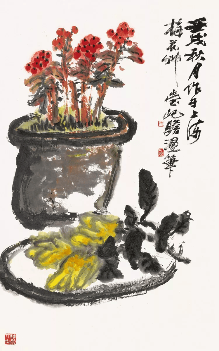 文革十年,朱屺瞻被迫停笔。1978年,朱屺瞻87岁时,被抄的齐白石所刻印章发还,他高兴而作《梅花草堂图》纪念。