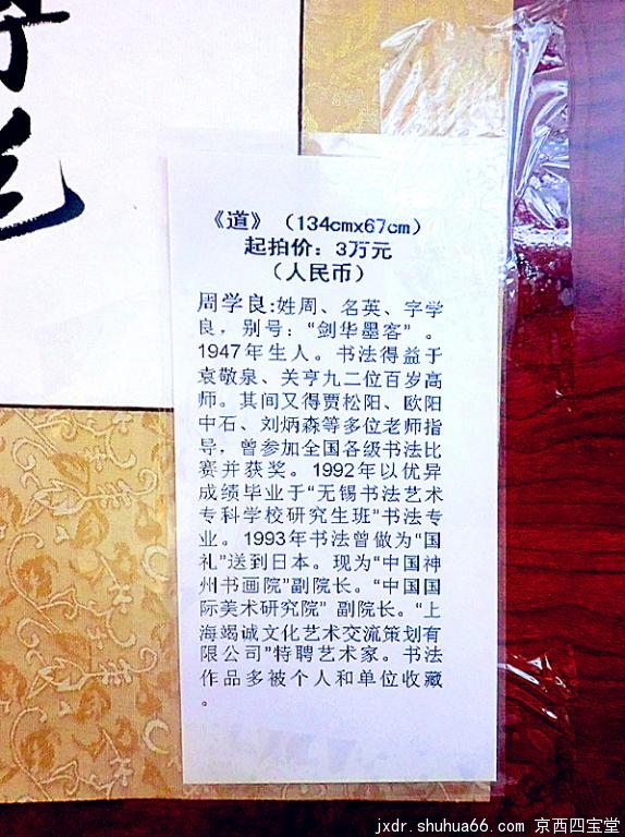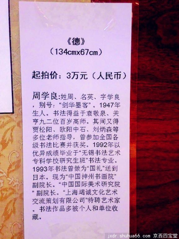 应朋友相邀周学良的“道”“德”二幅书法(四尺整张)同时拍出。因为国人呼唤“道德”,他的作品被布置在主席台左右二侧。左为“道”,右为“德”,就象“道德”的两扇大门分列左右。