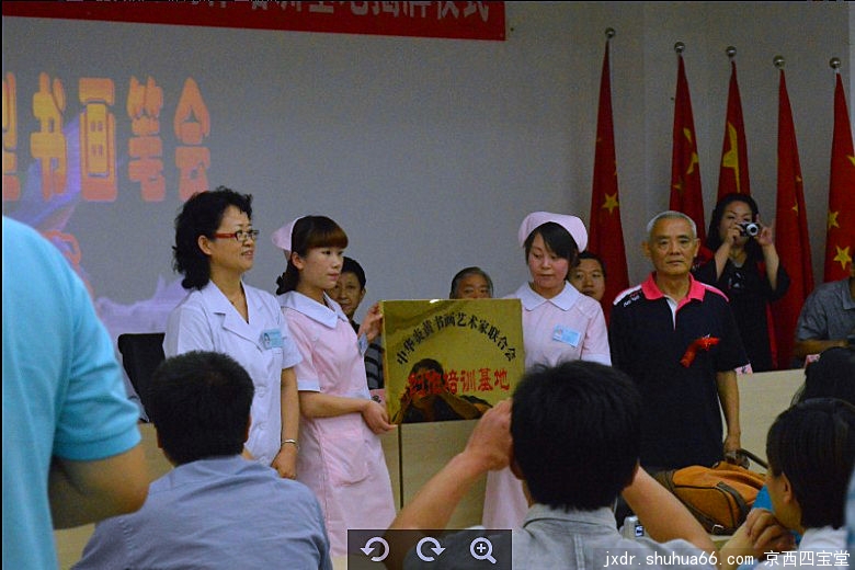 此次笔会有山西冀爱莲、山东鲍雪姐妹、河北安如华、天津赵志红等外地赶来参加笔会的同道。开幕式上周学良和医院院长为“书画创作培训基地”揭牌。